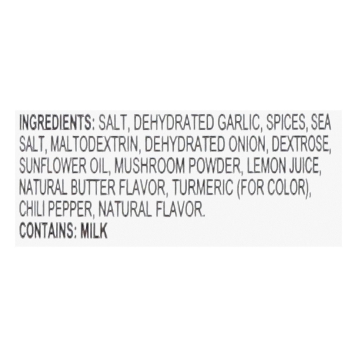 Salt, Dehydrated Garlic, Spices, Sea Salt, Maltodextrin, Dehydrated Onion, Dextrose, Sunflower Oil, Mushroom Powder, Lemon Juice, Natural Butter Flavor, Turmeric (for Color), Chili Pepper, Natural Fla…