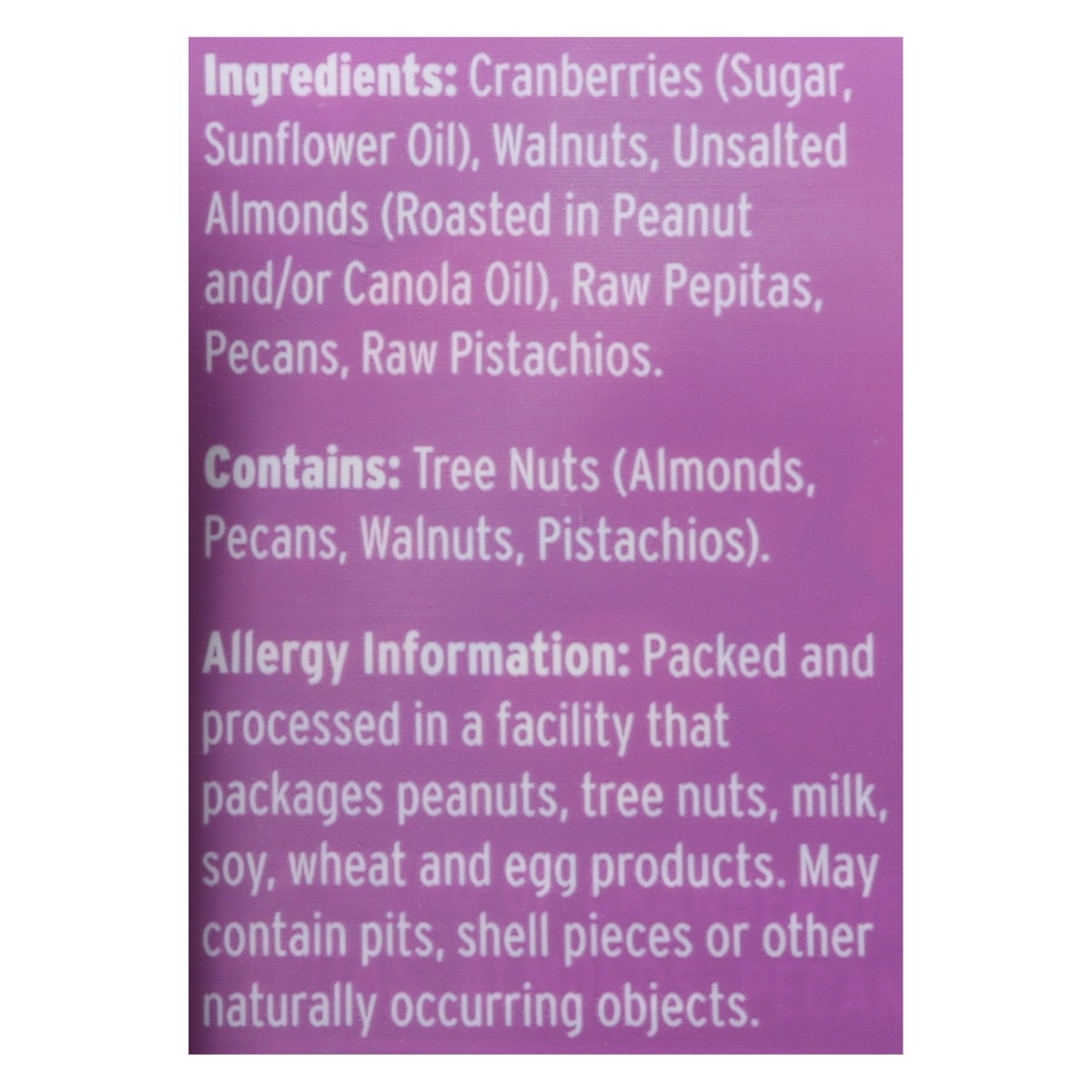 Cranberries (Sugar, Sunflower Oil), Walnuts, Unsalted Almonds (Roasted in Peanut and/or Canola Oil), Raw Pepitas, Pecans, Raw Pistachios.