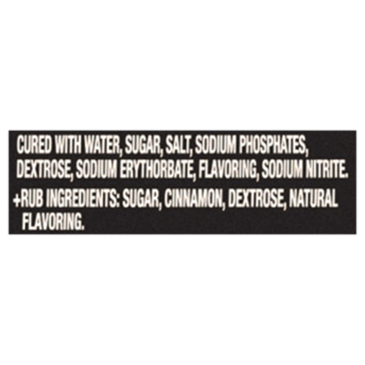 COATED WITH QUALIFIER (SEE INGREDIENT STATEMENT) Cured With Water, Sugar, Salt, Sodium Phosphates, Dextrose, Sodium Erythorbate, Flavoring, Sodium Nitrite. +Rub Ingredients: Sugar, Cinnamon, Dextrose,…