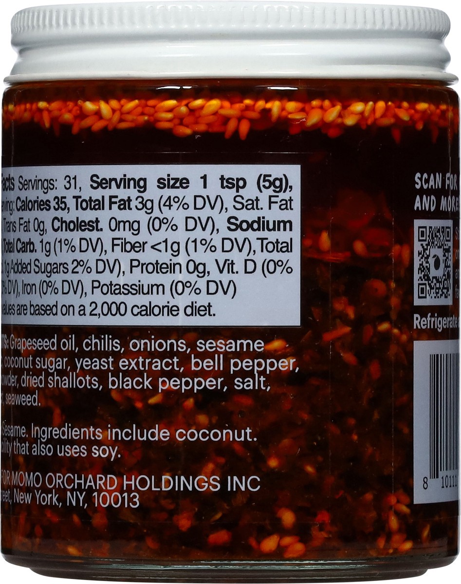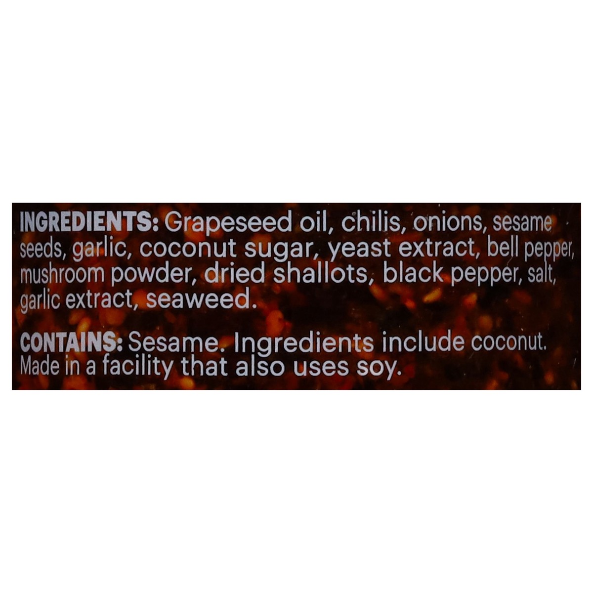 Grapeseed Oil, Chilis, Onions, Sesame Seeds, Garlic, Coconut Sugar, Yeast Extract, Bell Pepper, Mushroom Powder, Dried Shallots, Black Pepper, Salt, Garlic Extract, Seaweed.