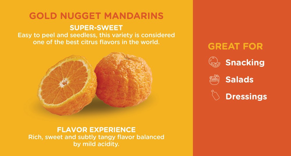 Gold Nugget mandarins are bumpy on the outside and delicious on the inside -- exceptionally sweet, always seedless and easy to peel. A good source of vitamin C.Just peel and eat, or toss segments into…