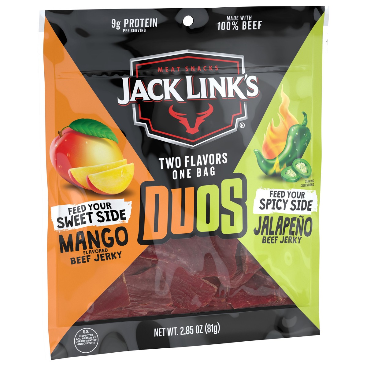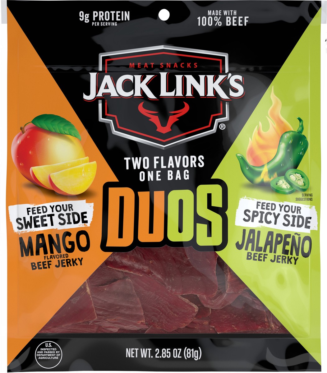 Two Flavors, One Bag! Jack Links Beef Jerky DUOs blends sweet mango flavors with spicy jalapeo flavors for a bold protein snack bag made with 100% beef.