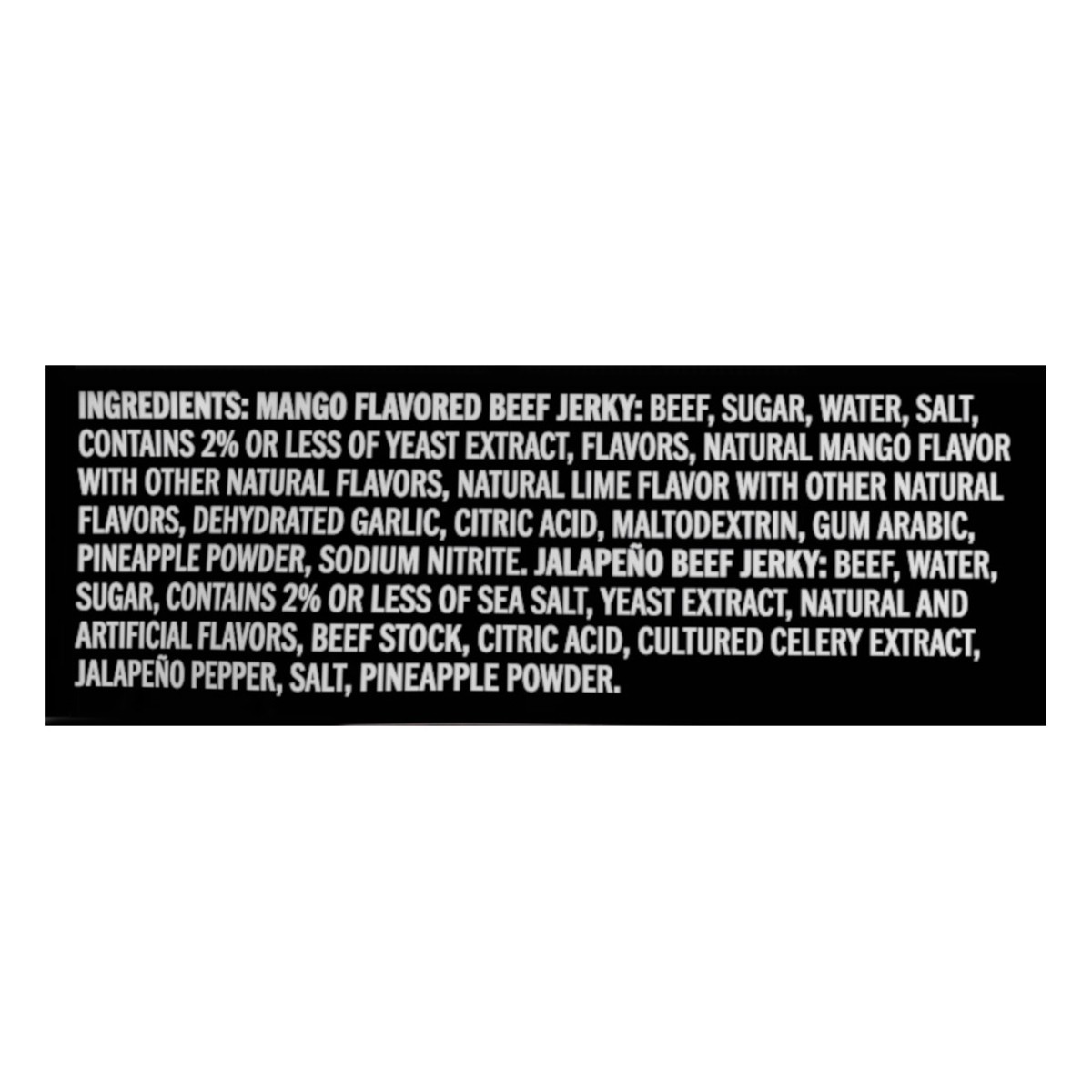 Mango Flavored Beef Jerky: Beef, Sugar, Water, Salt, Contains 2% or Less of Yeast Extract, Flavors, Natural Mango Flavor with Other Natural Flavors, Natural Lime Flavor with Other Natural Flavors, Deh…