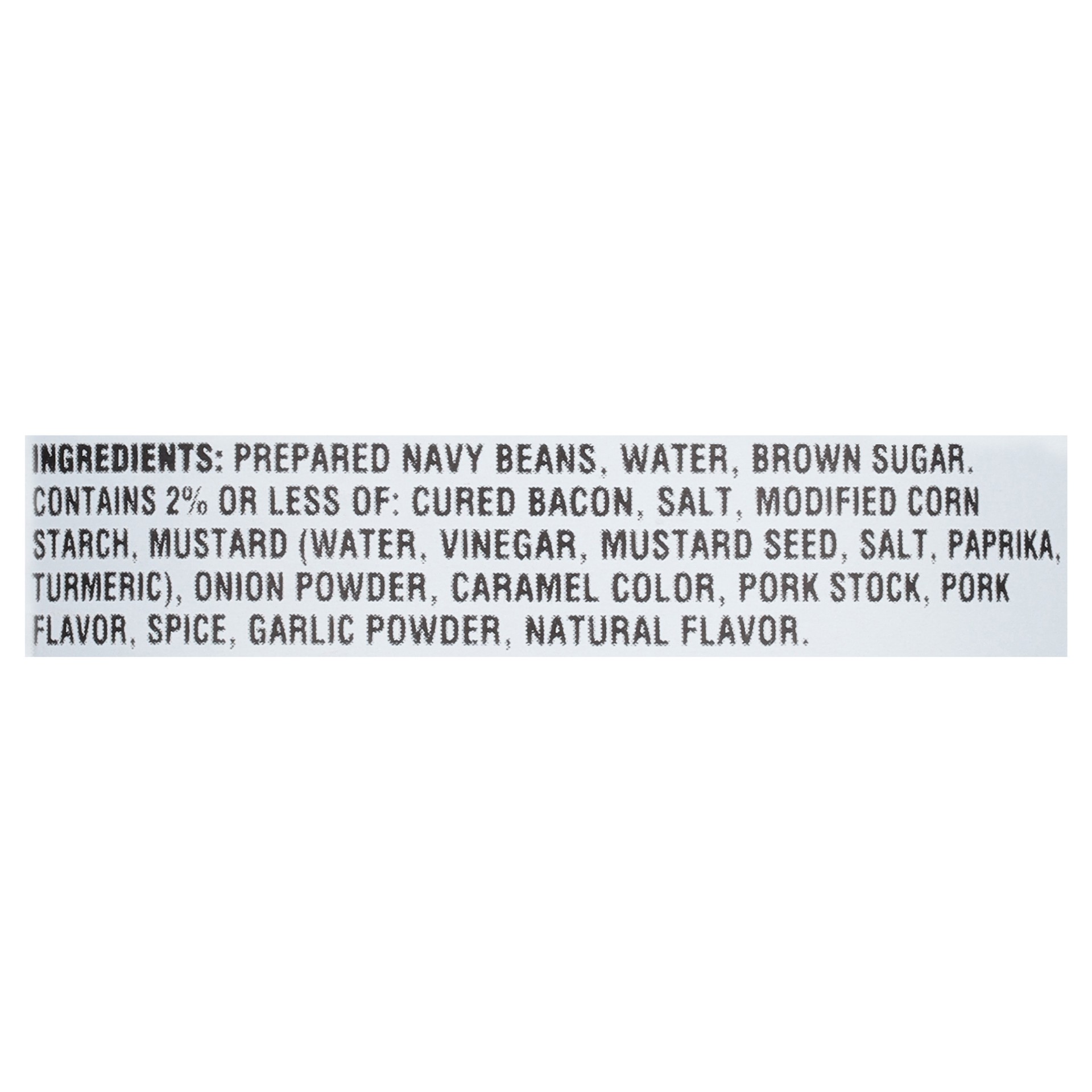 Prepared Navy Beans, Water, Brown Sugar. Contains 2% or less of: Cured Bacon, Salt, Modified Corn Starch, Mustard (Water, Vinegar, Mustard Seed, Salt, Paprika, Turmeric), Onion Powder, Caramel Color, …