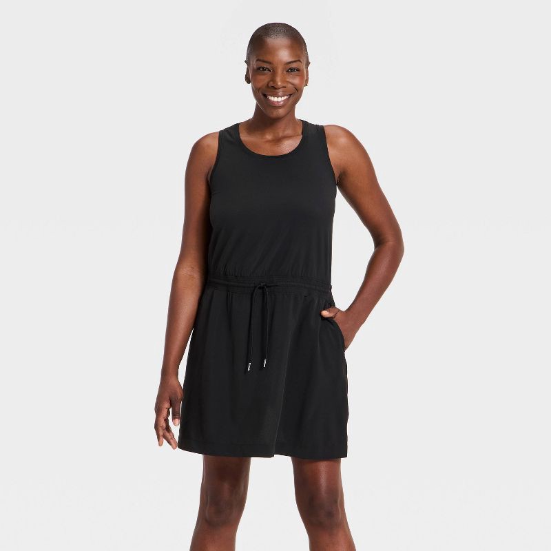 Why we're ALL IN:Active light travel dress in a solid shade with stretchy, drawstring-cinched waist. Tailored in a sleeveless silhouette with a crew neckline and athletic fit. Made from lightweight re…