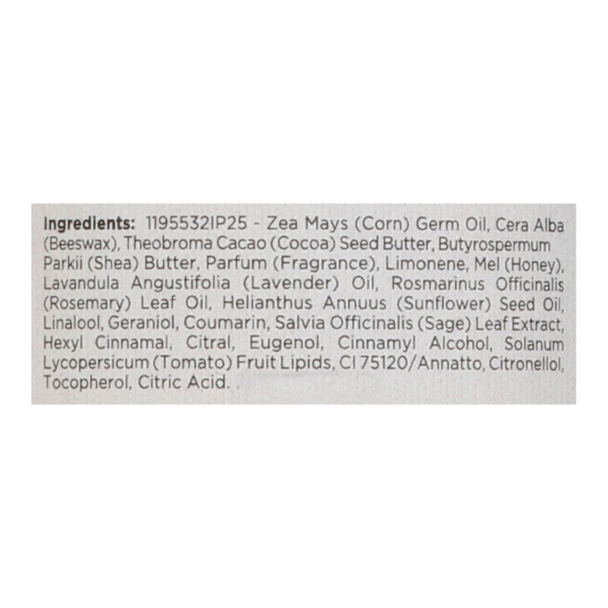11955321p29 Zea Mays (Corn) Germ Oil, Cera Alba (Beeswax), Theobroma Cacao (Cocoa) Seed Butter, Butyrospermum Parkii (Shea) Butter, Parfum (Fragrance), Limonene, Mel (Honey), Lavandula Angustifolia (L…