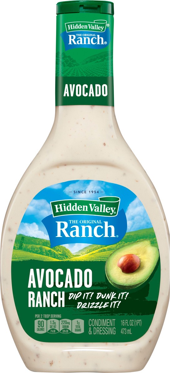 Give every meal more delicious flavor with Hidden Valley Avocado Ranch Dressing. Made with avocado and Hidden Valley''s secret blend of herbs and spices, this thick and creamy dressing is a family fav…