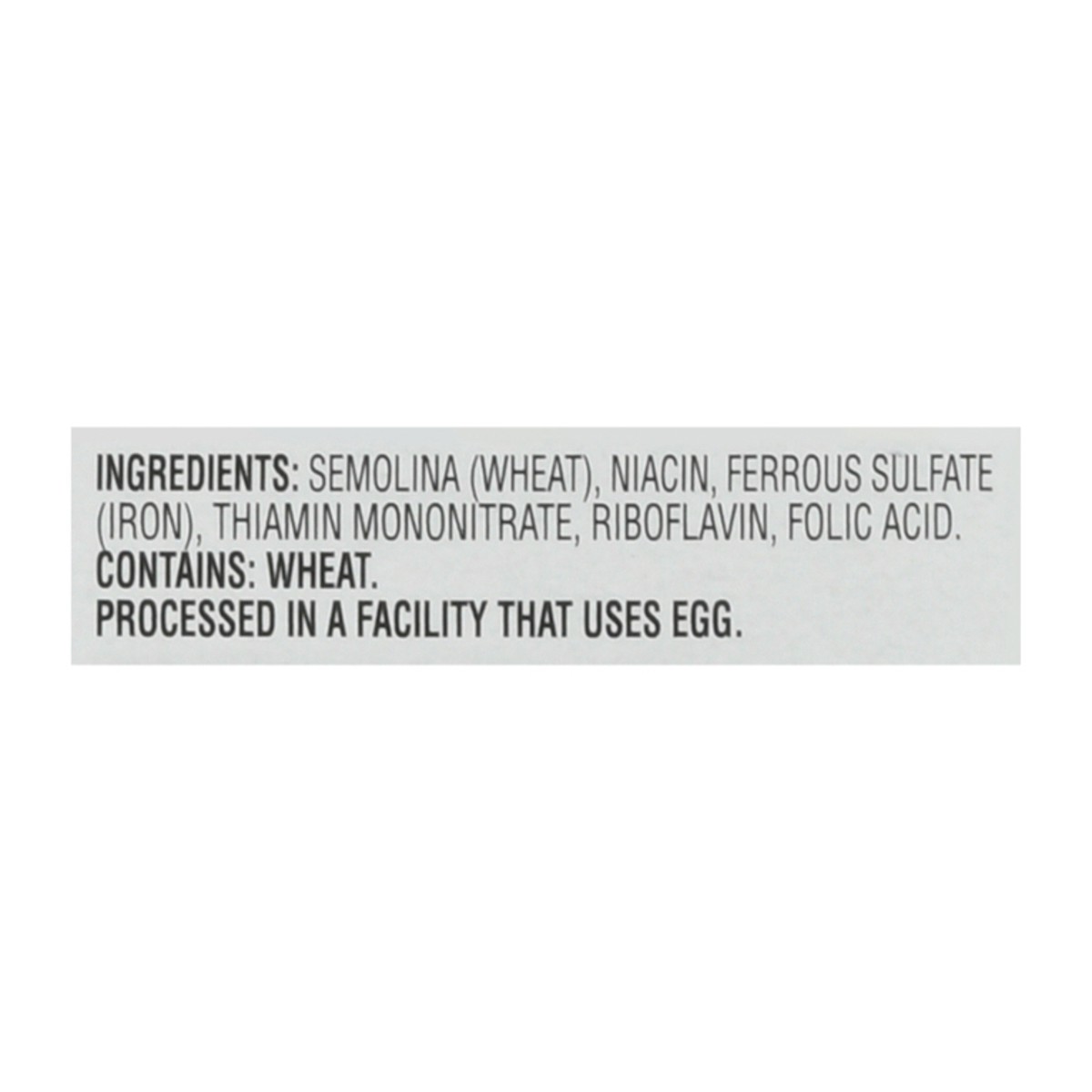 Semolina (Wheat), Niacin, Ferrous Sulfate (Iron), Thiamin Mononitrate, Riboflavin, Folic Acid.