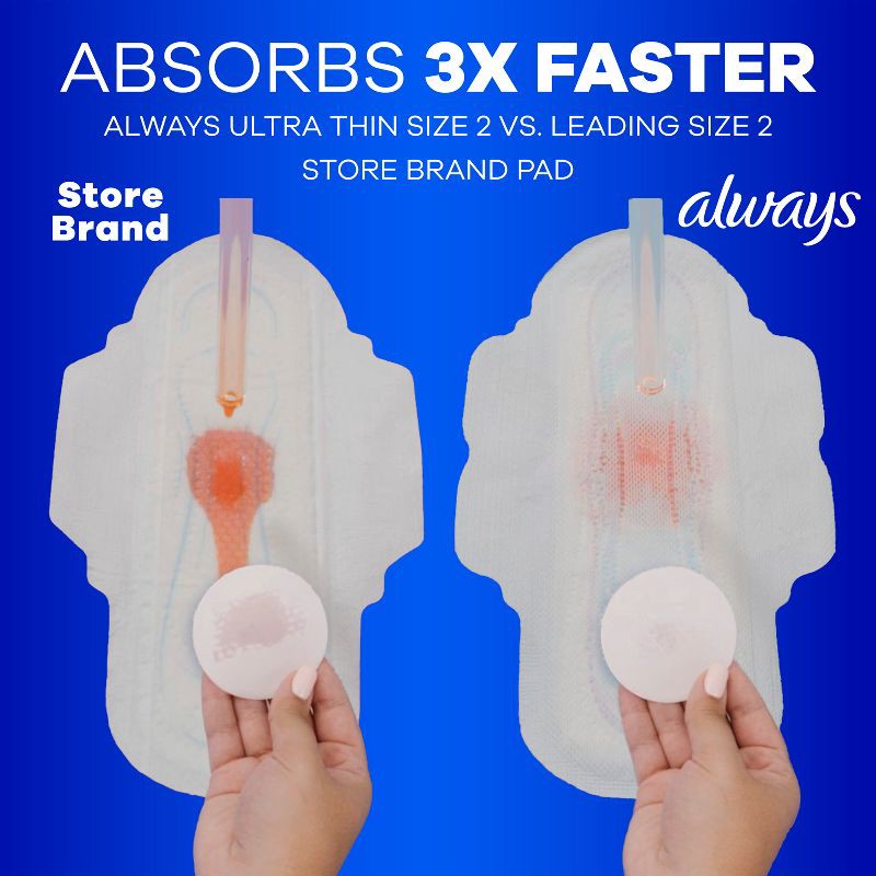 - ABSORBS 3X FASTER (Always Ultra Thin Size 2 versus leading Size 2 store brand pad)