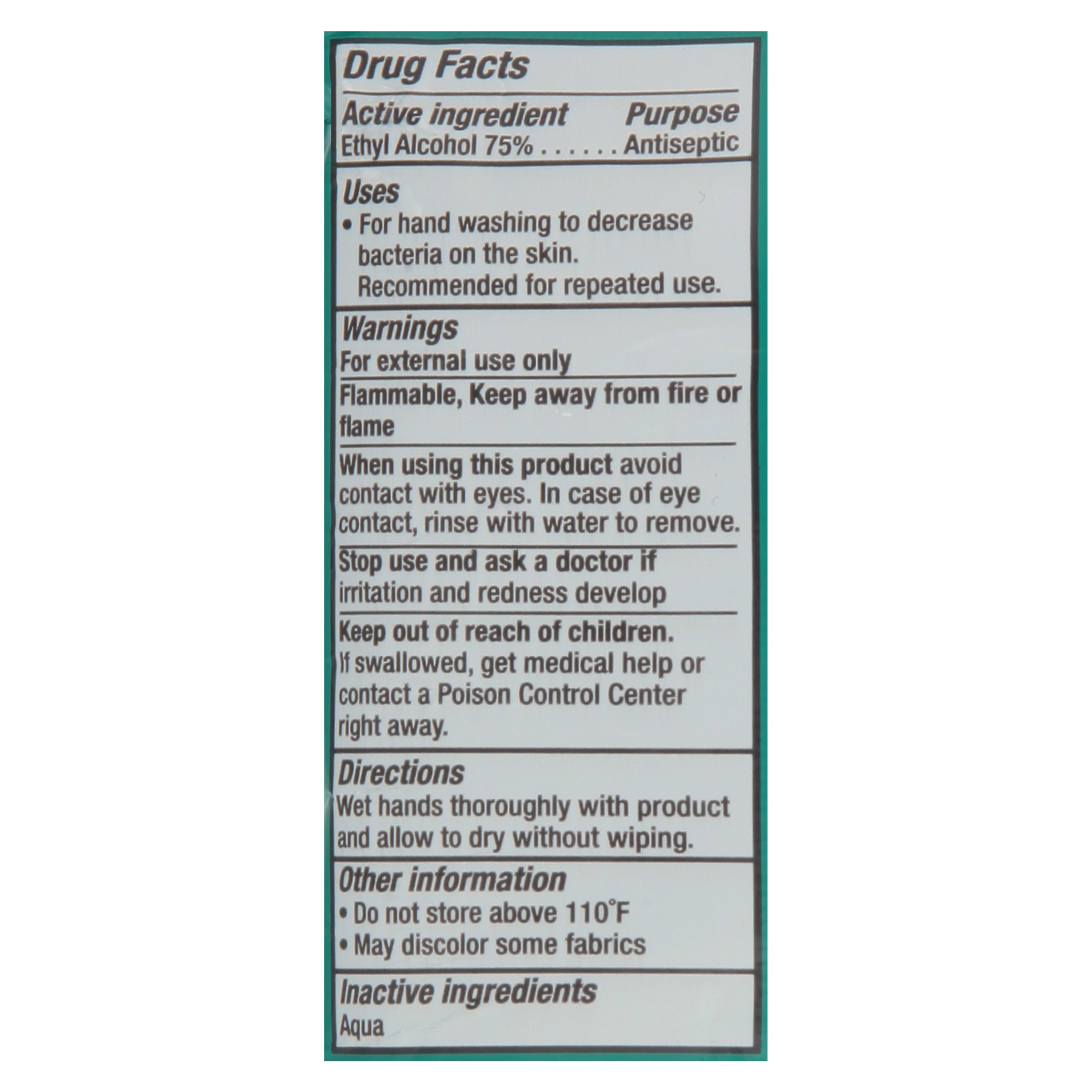Active Ingredients: Ethyl Alcohol (75 %), Antiseptic. Inactive Ingredients: Aqua.