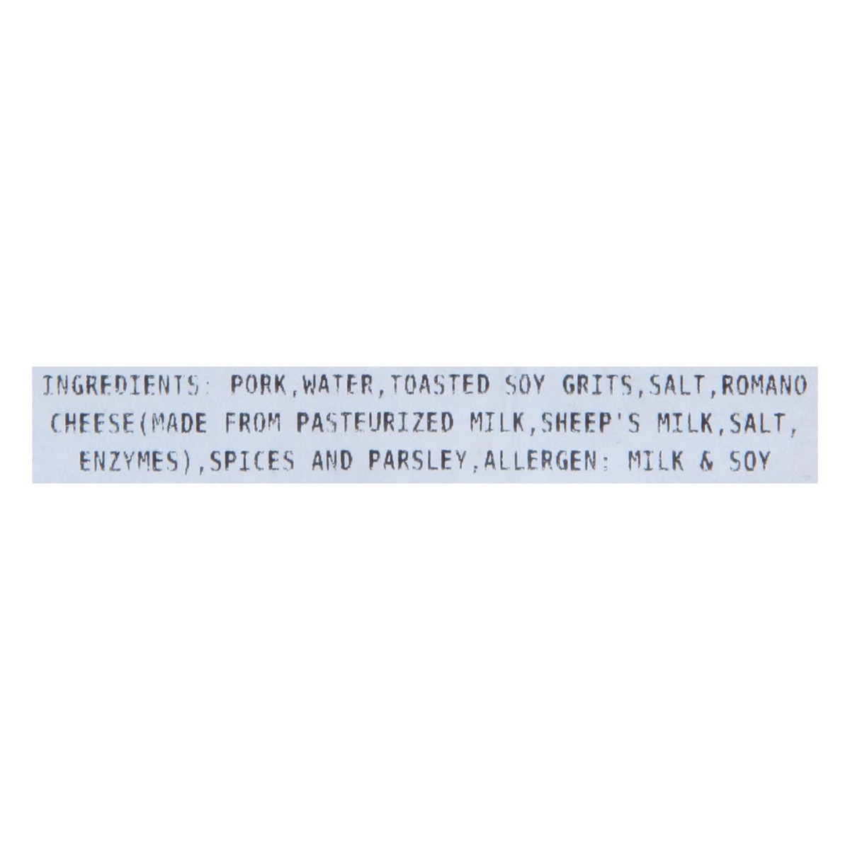 Pork, Water, Toasted Soy Grits, Salt, Romano Cheese (Made from Pasteurized Milk, Sheep''s Milk, Salt, Enzymes), Spices and Parsley.