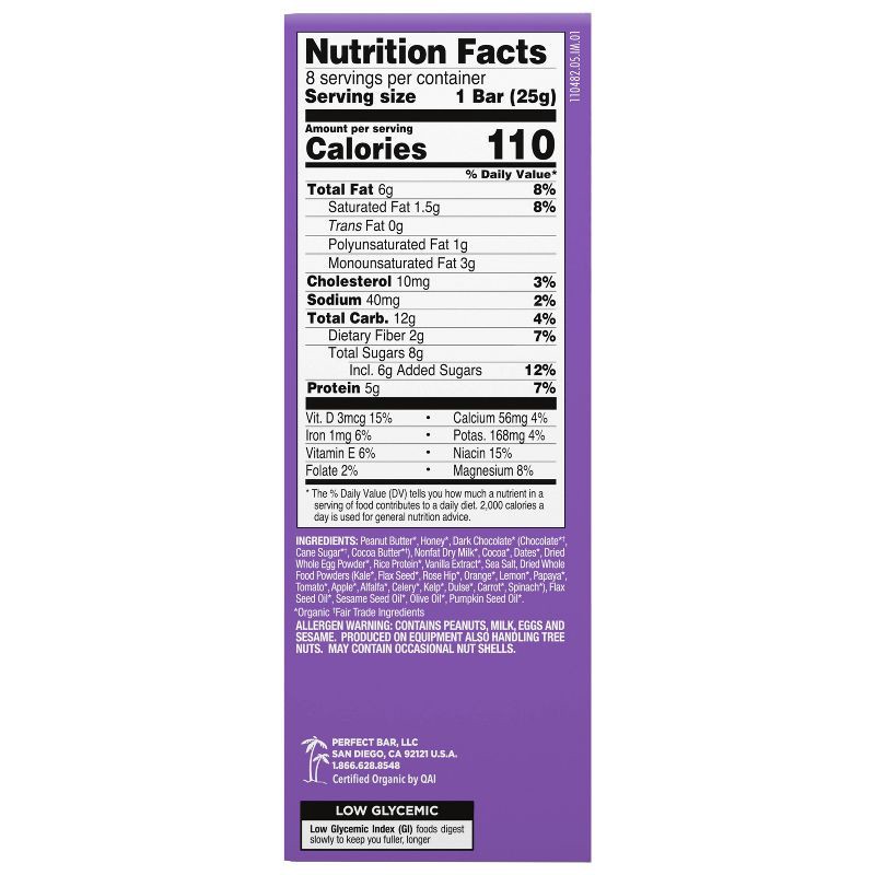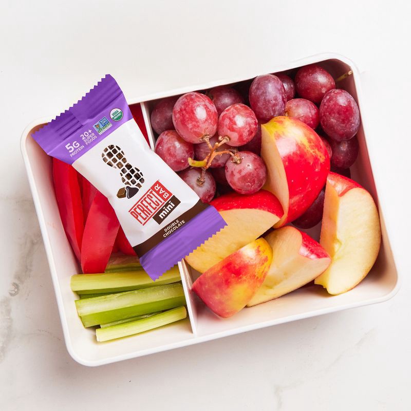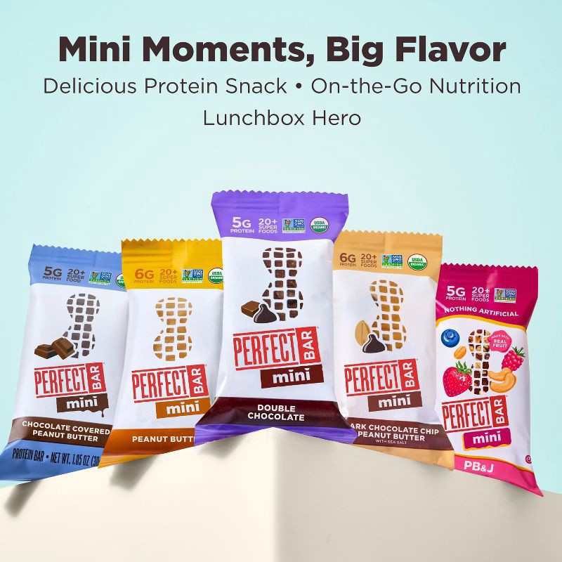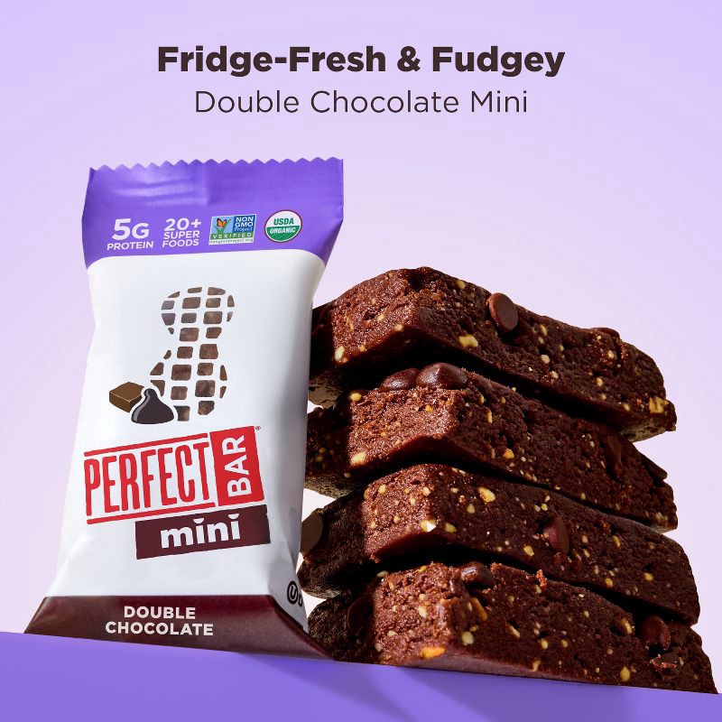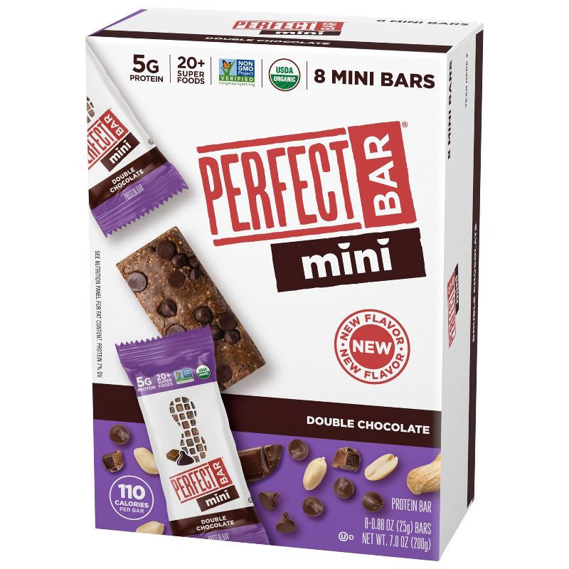 - PERFECT BAR MINI DOUBLE CHOCOLATE PROTEIN BAR: Eight .88-oz organic protein bars with freshly ground organic peanut butter, organic honey, dark chocolate, a satisfying cookie dough texture, whole food protein, and 20+ superfoods
