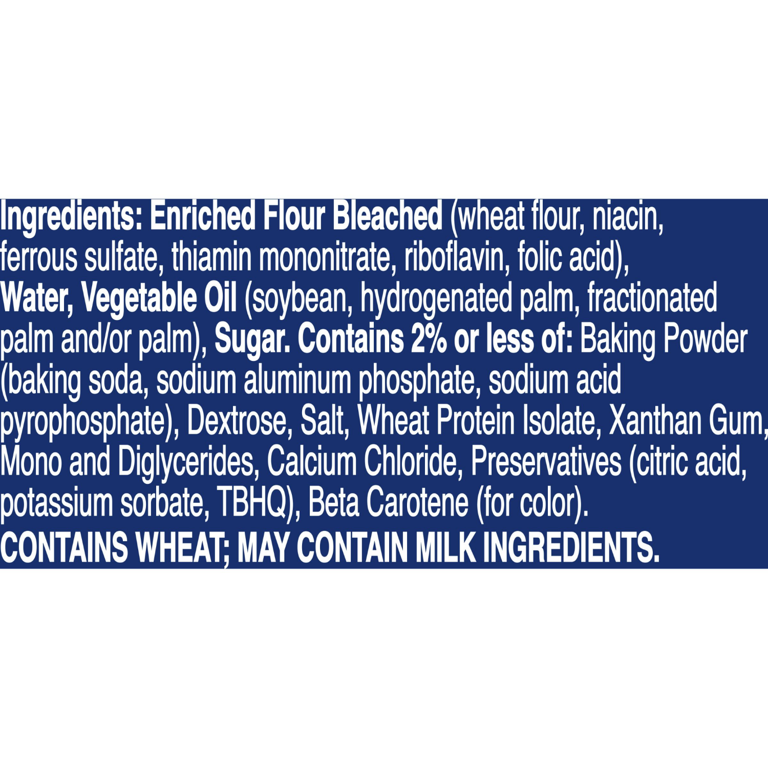 Enriched Flour Bleached (Wheat Flour, Niacin, Ferrous Sulfate, Thiamin Mononitrate, Riboflavin, Folic Acid), Water, Soybean and Palm Oil, Sugar, Hydrogenated Palm Oil, Baking Powder (Sodium Acid Pyrop…