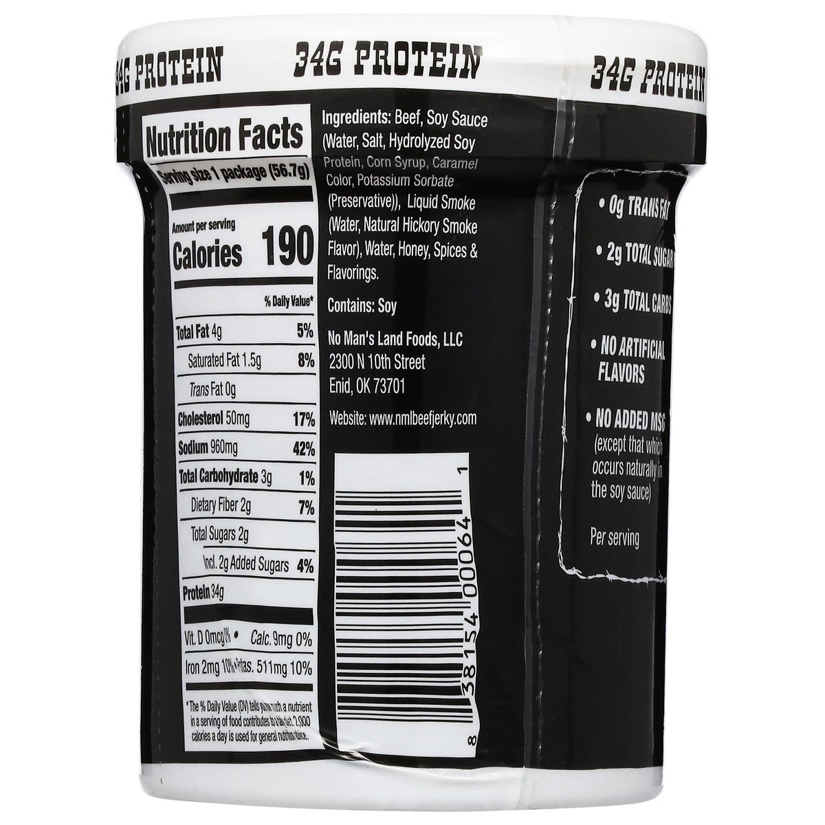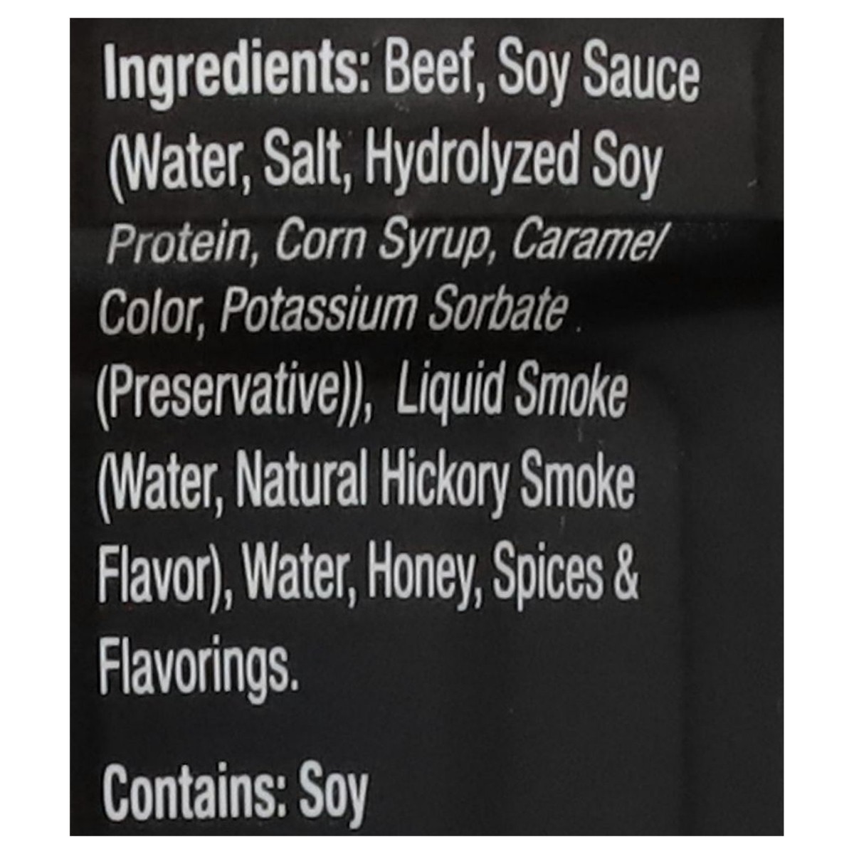Beef, Soy Sauce (Water, Salt, Hydrolyzed Soy Protein, Corn Syrup, Caramel Color, Potassium Sorbate (Preservative)), Liquid Smoke (Water, Natural Hickory Smoke Flavor), Water, Honey, Spices & Flavoring…