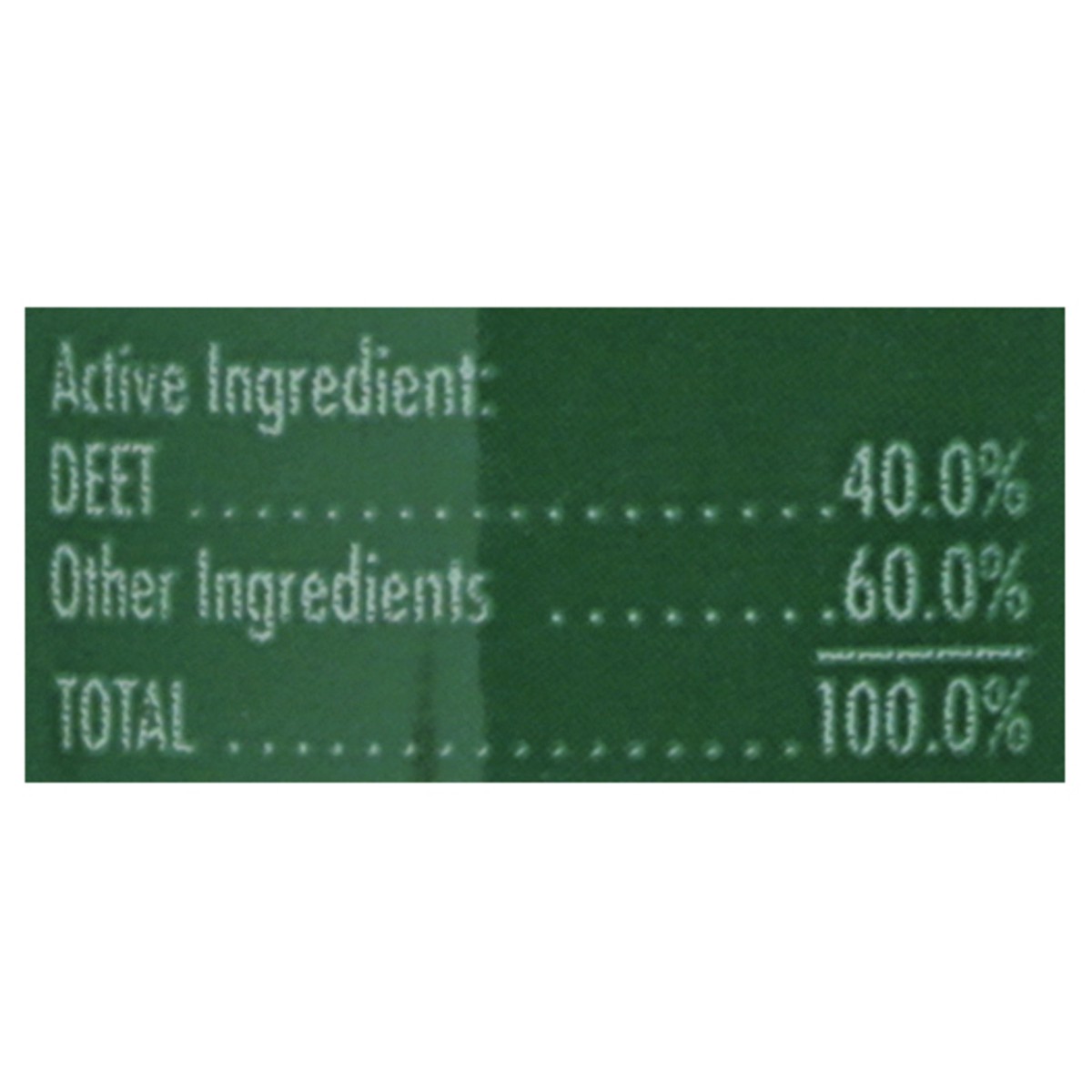 Deet (40.0%), Other Ingredients (60.0%), Total (100.0%).