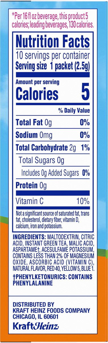 Natural flavor with other natural flavor. 5 calories per packet. 15 mg caffeine per serving. Gluten free. Sugar free. Low calorie. Good source of vitamin C. Low sodium. Made with Green tea. 10 On-the-…
