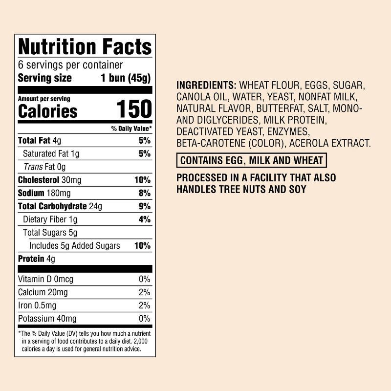 WHEAT FLOUR, EGGS, SUGAR, CANOLA OIL, WATER, YEAST, NONFAT MILK, NATURAL FLAVOR, BUTTERFAT, SALT, MONO- AND DIGLYCERIDES, MILK PROTEIN, DEACTIVATED YEAST, ENZYMES, BETA-CARO- TENE (COLOR), ACEROLA EXT…