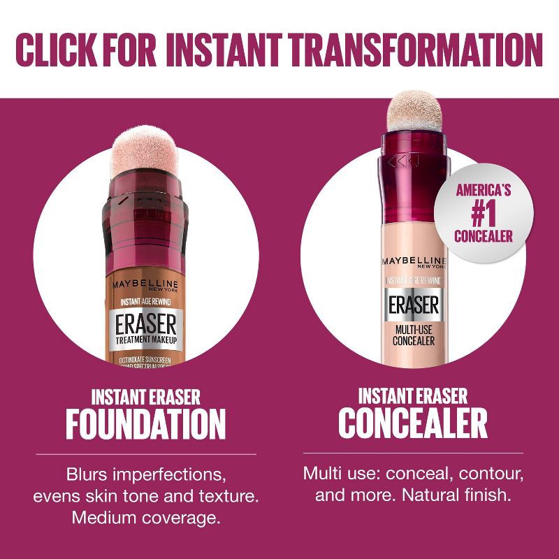Maybelline New York's Instant Age Rewind Eraser Treatment Foundation with SPF 20 blurs early signs of aging in an instant. Blur uneven skin tone, fine lines, and dark circles in just a click. This moi…