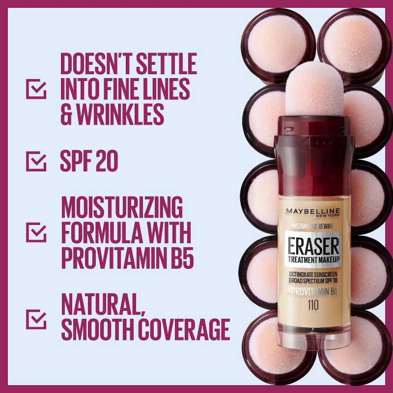 - Click to Instantly Blur: Maybelline's Instant Age Rewind Eraser Treatment Foundation with SPF 20 covers uneven skin tone, fine lines and wrinkles for a natural look that lasts; the blurring built-in applicator of this moisturizing foundation erases lines while the sponge tip glides on ultra-smooth for a natural finish that won't settle into fine lines and wrinkles