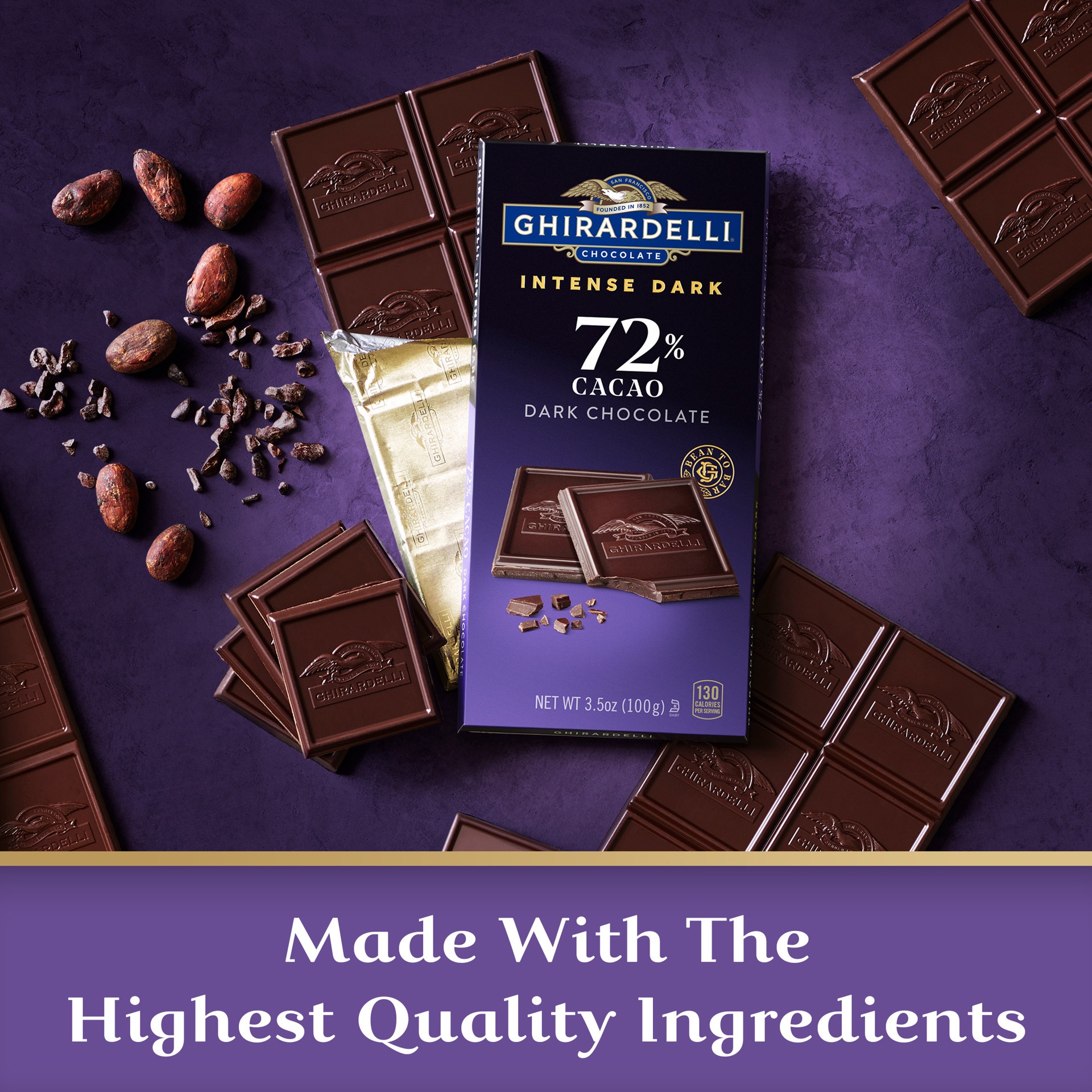 Each square of the GHIRARDELLI Intense Dark 72% Cacao Chocolate Bar caters to your senses. Indulge in the intensity after dinner, or serve GHIRARDELLI Intense Dark chocolate candy at your next gatheri…