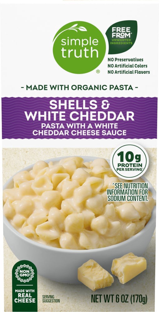 Simple Truth® White Cheddar Shells and Cheese tantalizes taste buds! Each serving has 10g of protein, complementing the delightful, cheesy flavor. Containing no preservatives, artificial colors, or ar…