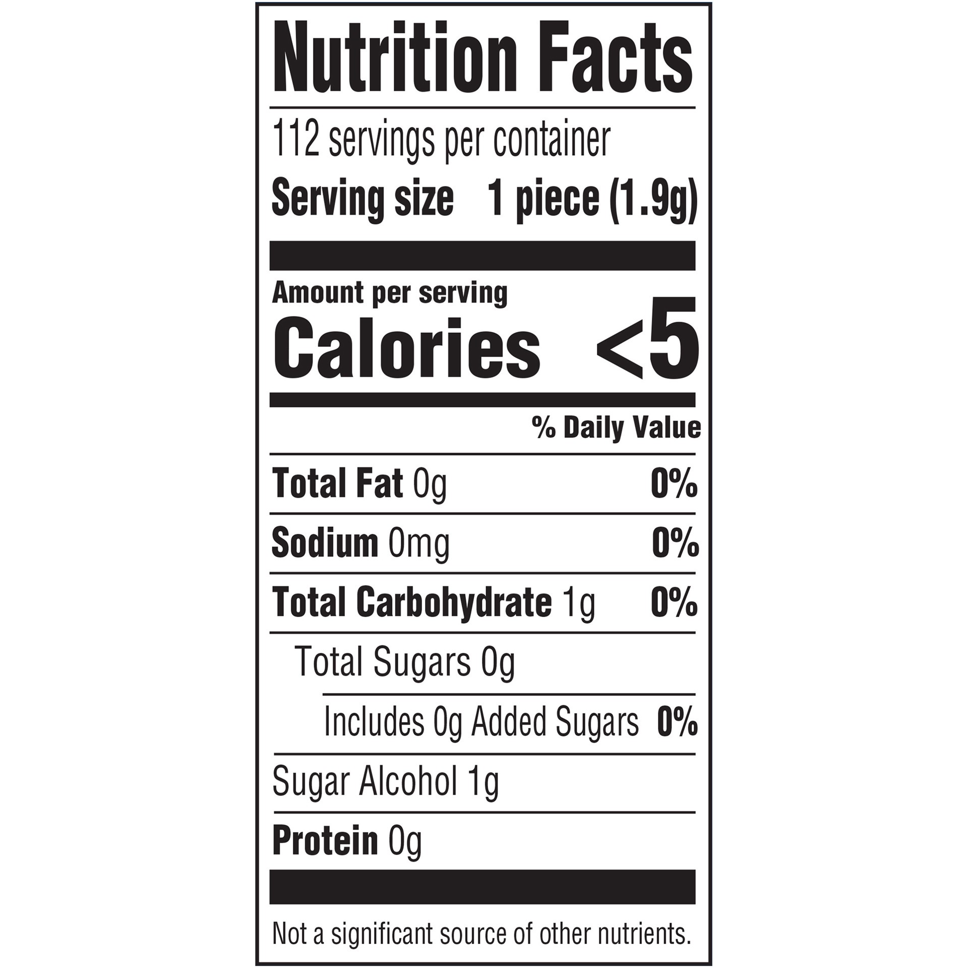 Made of: Sorbitol, Gum Base, Glycerol, Natural and Artificial Flavors; Less than 2% of: Hydrogenated Starch Hydrolysate, Aspartame, Mannitol, Acesulfame K, Soy Lecithin, Xylitol, BHT (to Maintain Fres…