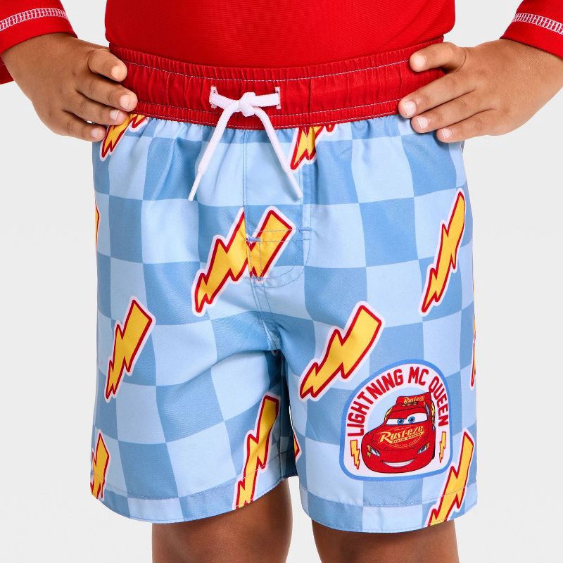 - Shorts are designed with blue checkerboard pattern with lightning bolts and Lightning McQueen patch