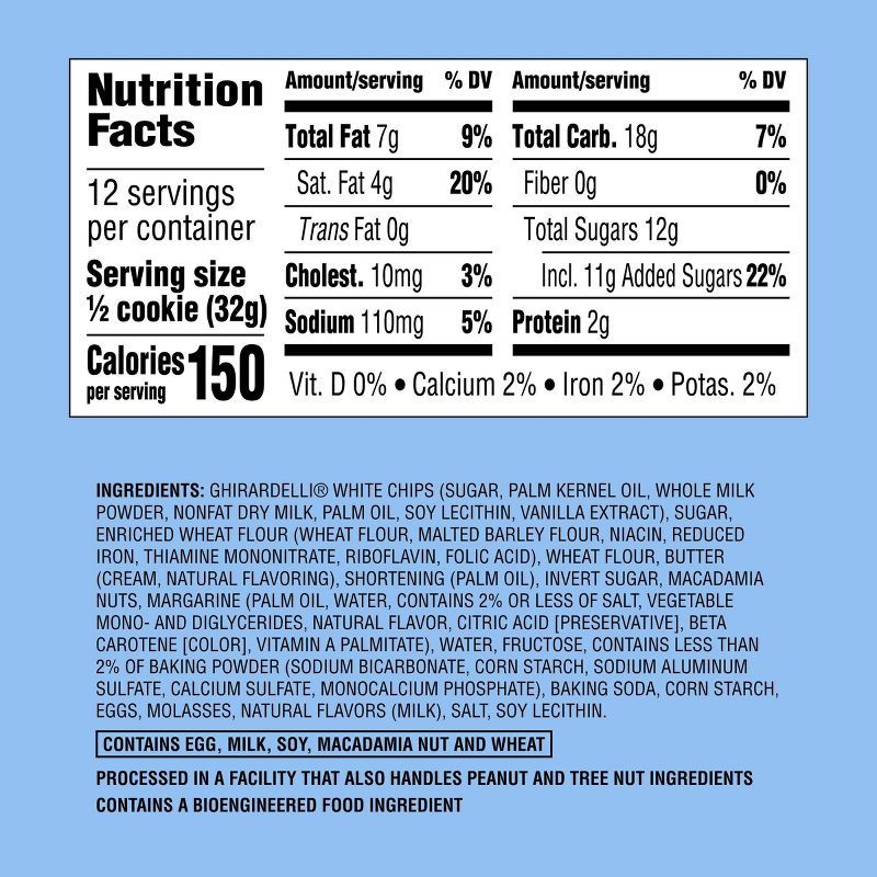 GHIRARDELLI WHITE CHIPS (SUGAR, PALM KERNEL OIL, WHOLE MILK POWDER, NONFAT DRY MILK, PALM OIL, SOY LECITHIN, VANILLA EXTRACT), SUGAR, ENRICHED WHEAT FLOUR (WHEAT FLOUR, MALTED BARLEY FLOUR, NIACIN, RE…