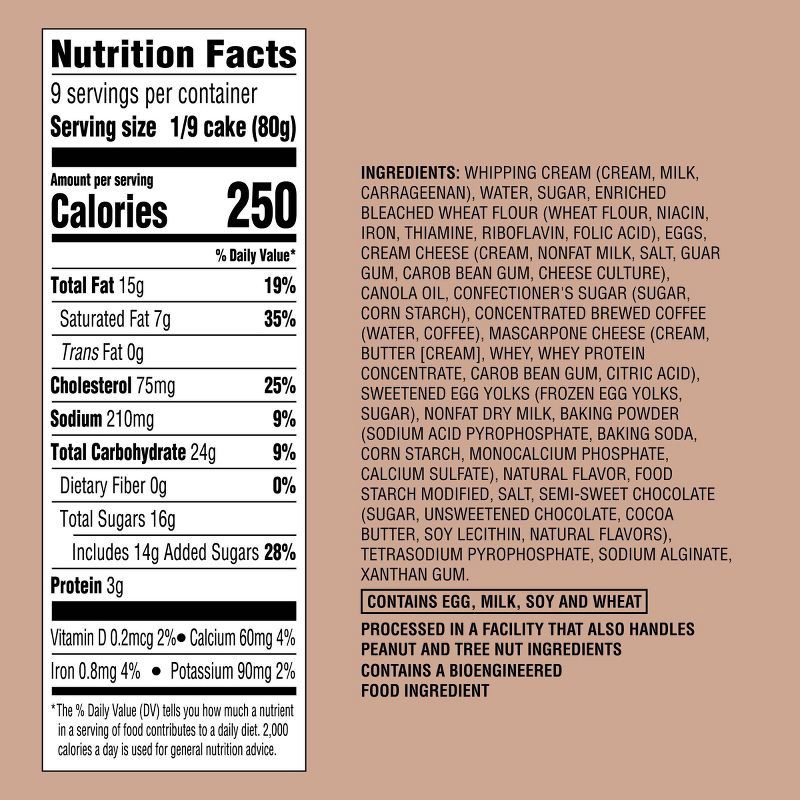 - Made with espresso coffee-flavored sponge cake layered with cream cheese and mascarpone mousse topped with whipped cream