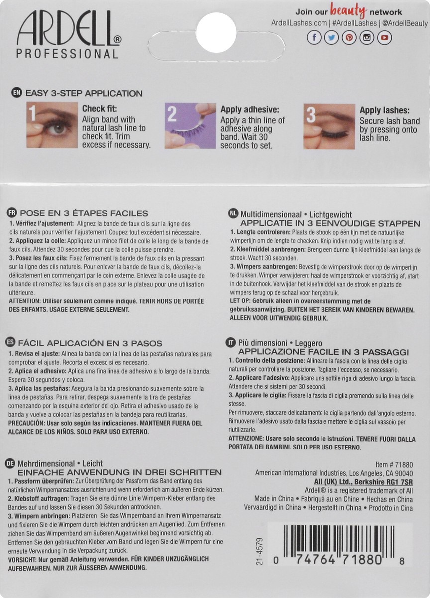 Contains 4 pair of lashes. Multi-dimensional. Lightweight. Invisiband. ArdellLashes.com. Join our beauty network. (hashtag)ArdellLashes. (at)ArdellBeauty. Facebook. Twitter. Pinterest. Instagram. YouT…