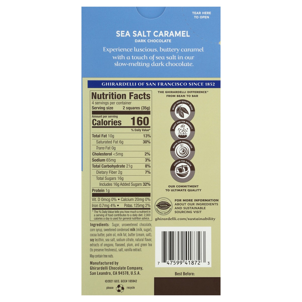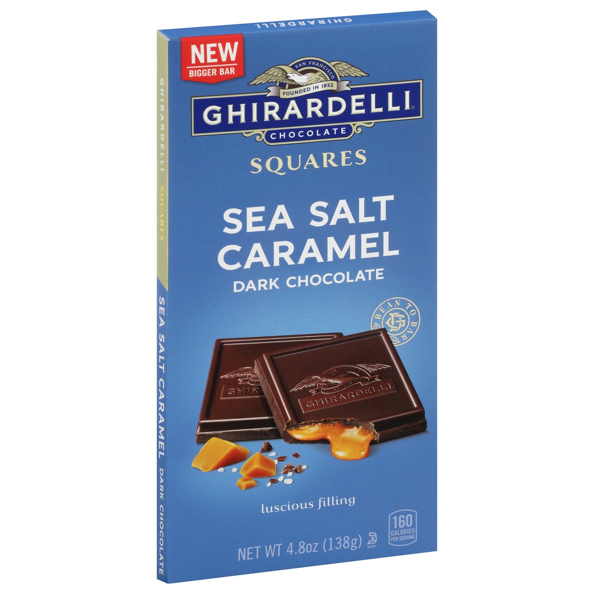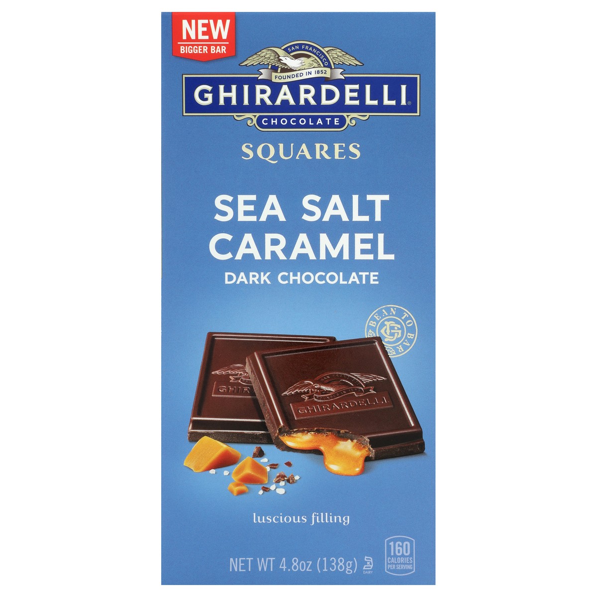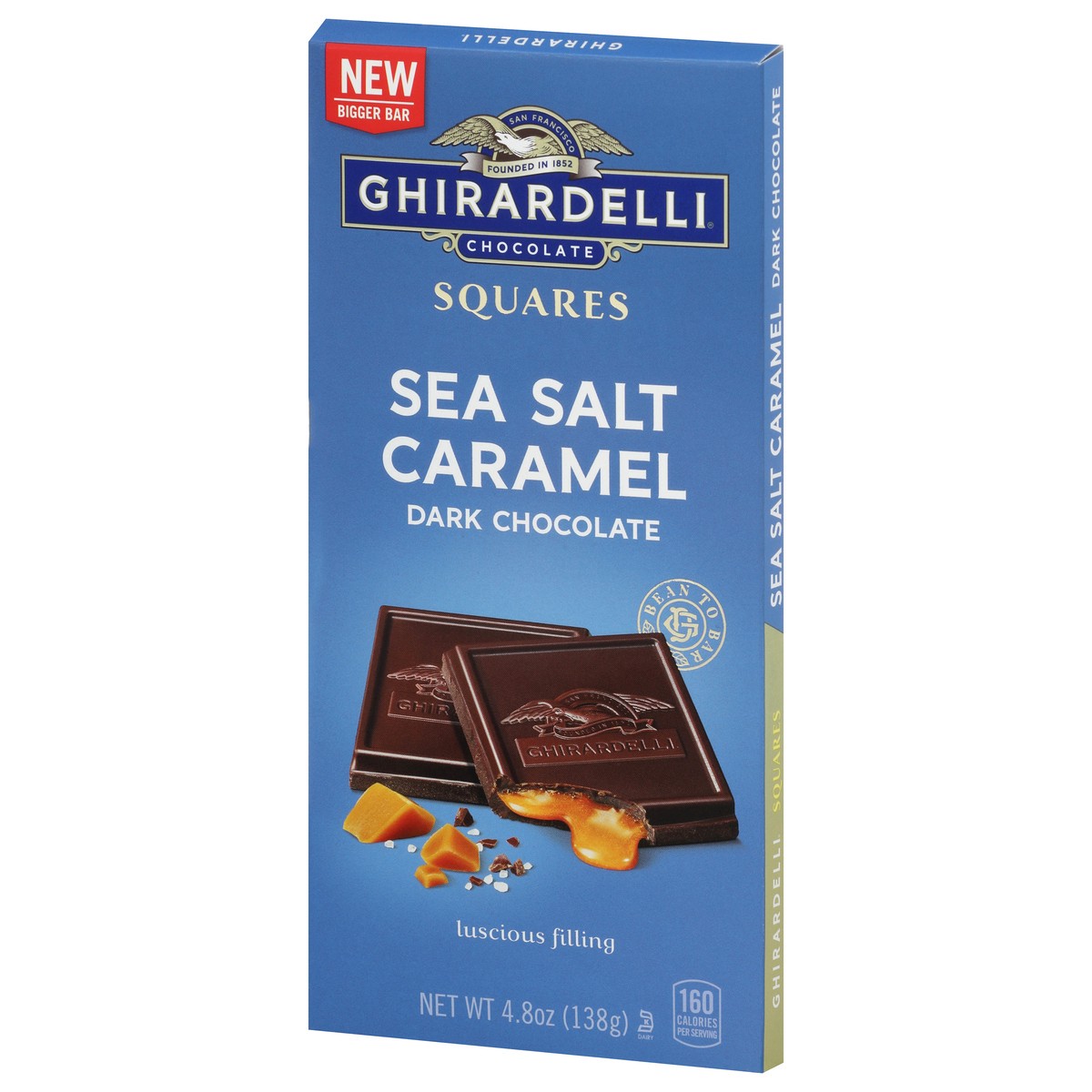 New bigger bar. Founded in 1852. Luscious filling. Bean to bar. Experience luscious, buttery caramel with a touch of sea salt in our slow-melting dark chocolate. Ghirardelli of San Francisco since 18…