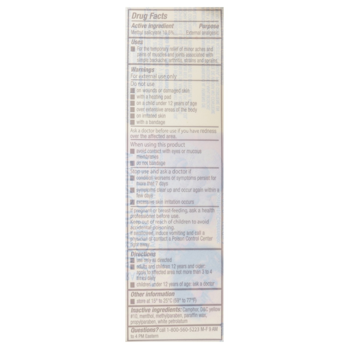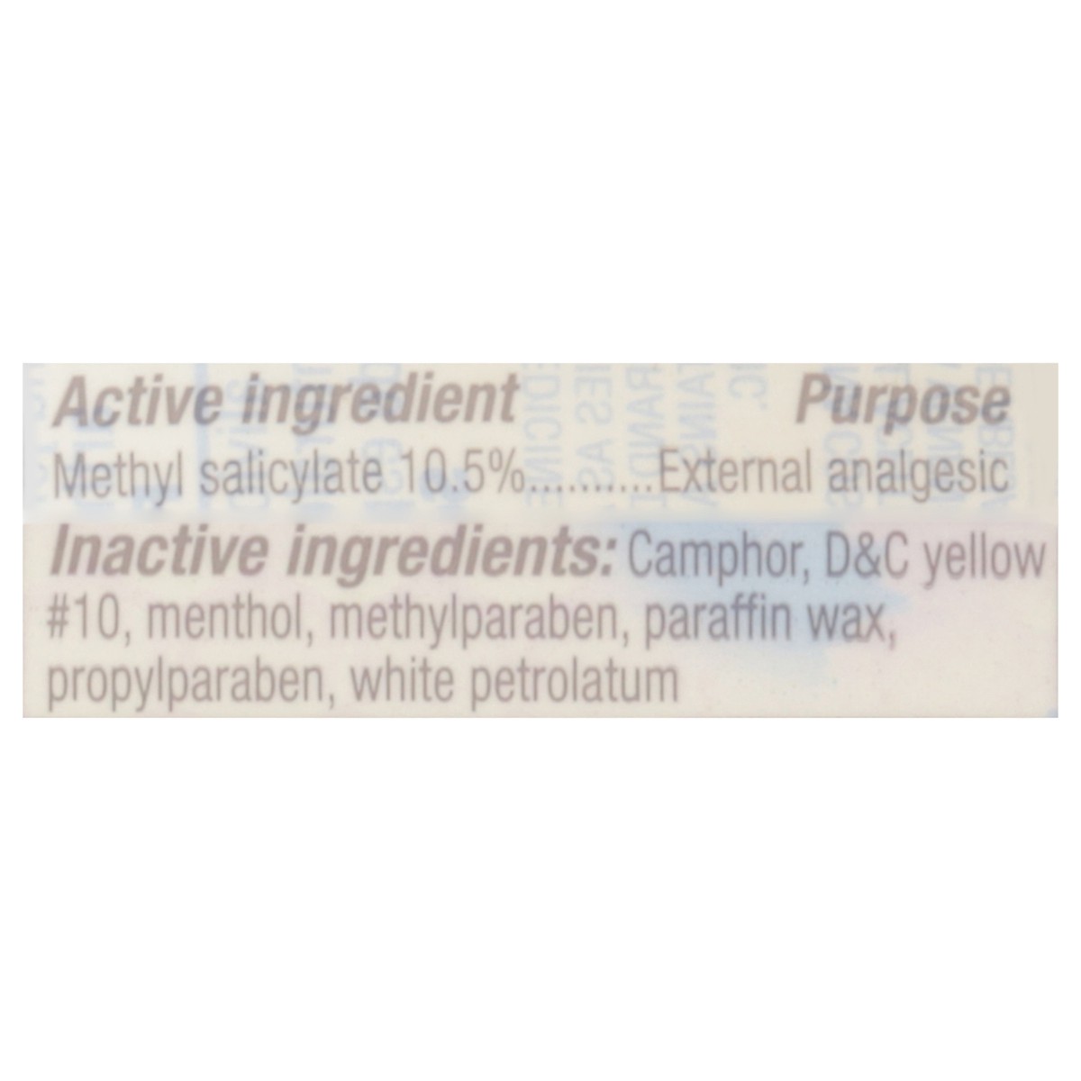 Active Ingredients: Methyl Salicylate (10.5 %), External Analgesic. . Inactive Ingredients: Camphor, D&C Yellow #10, Menthol, Methylparaben, Paraffin Wax, Propylparaben, White Petrolatum.