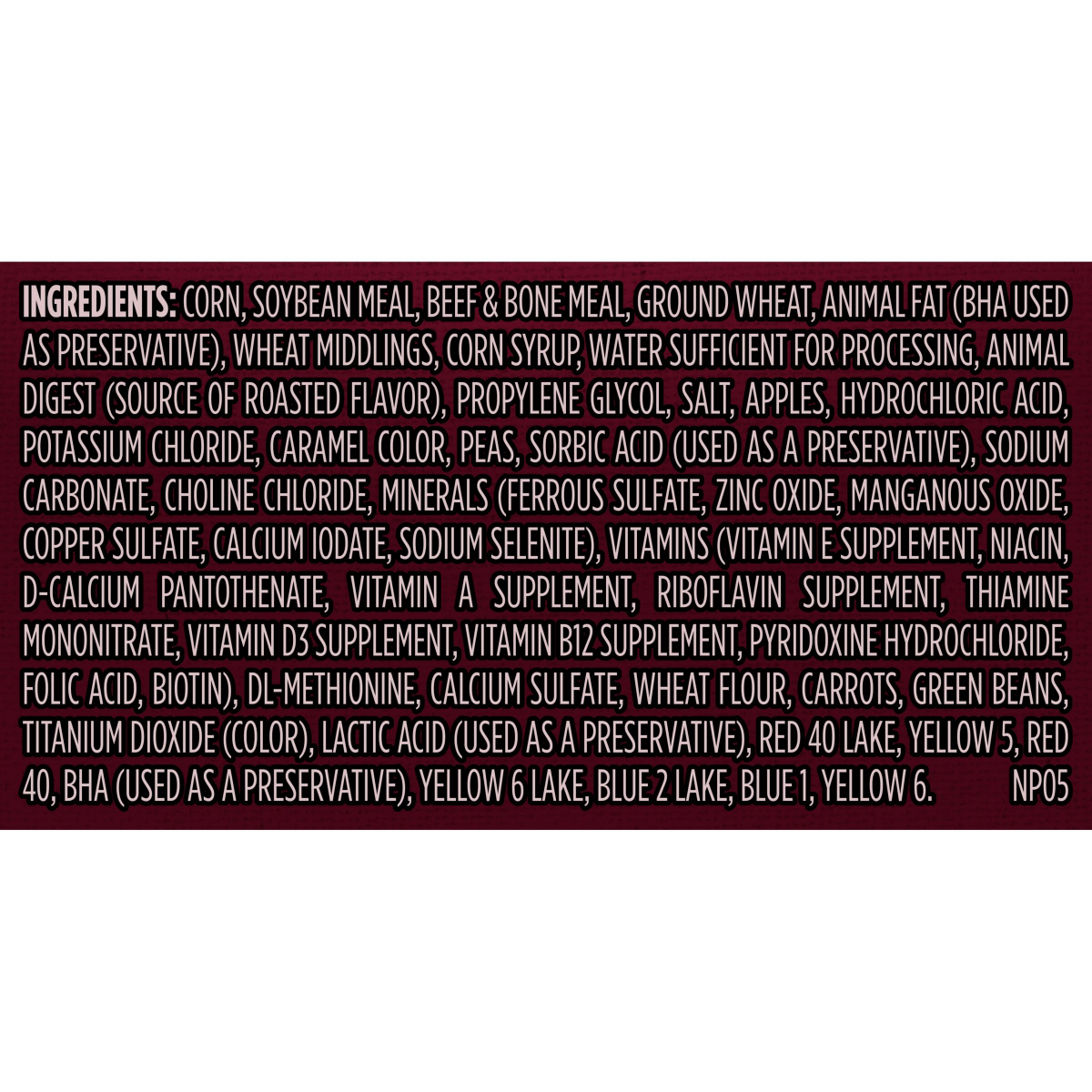 Whole Corn, Soybean Meal, Beef & Bone Meal, Whole Wheat, Wheat Middlings, Animal Fat (BHA usedas a preservative), Corn Syrup, Water, Natural Flavor (Source of Chicken Flavor), Propylene Glycol, Sa…