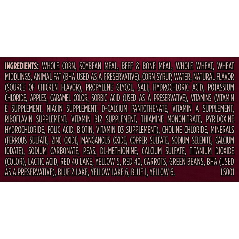 Whole Corn, Soybean Meal, Beef & Bone Meal, Whole Wheat, Wheat Middlings, Animal Fat (BHA Used as a Preservative), Corn Syrup, Water, Natural Flavor (Source of Chicken Flavor), Propylene Glycol, Salt,…