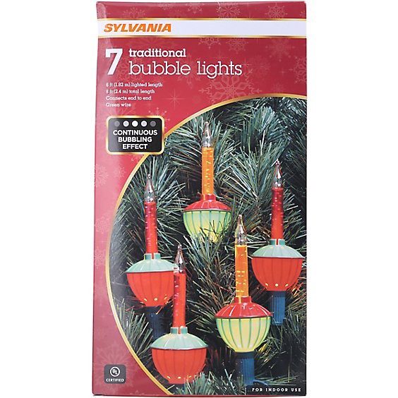 6 ft (1.82 m) lighted length. 8 ft (2.4 m) total length. Connects end to end. Green wire. Continuous bubbling effect. For indoor use. UL Certified. Made in China.