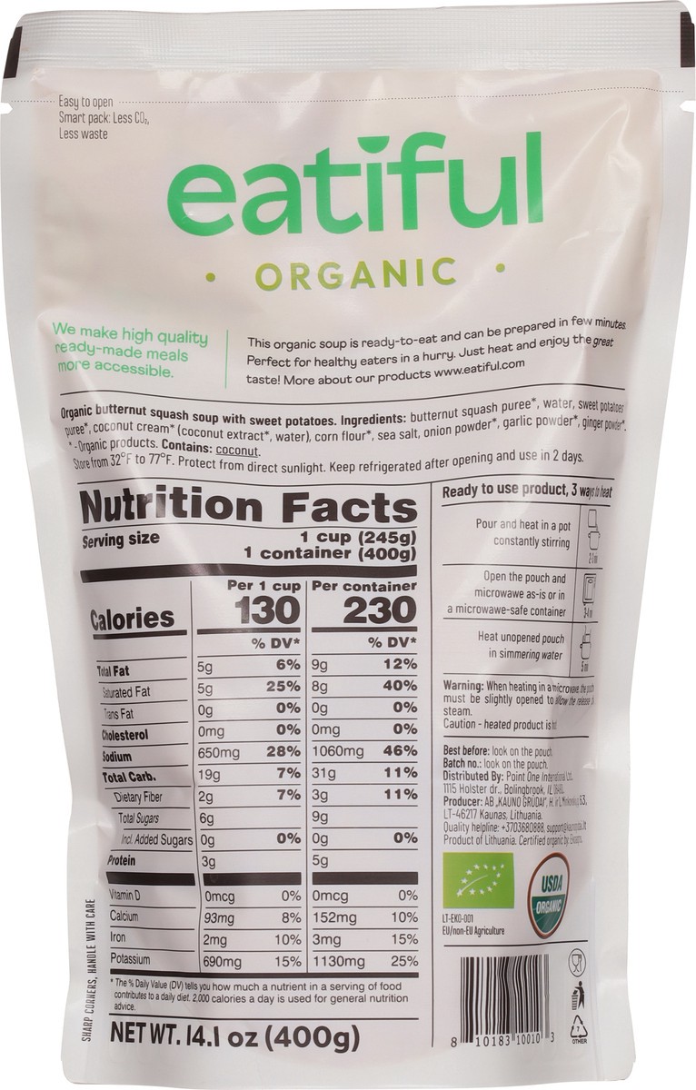 Organic Butternut Squash Soup with Sweet Potatoes, Butternut Squash Puree*, Water, Sweet Potatoes Puree*, Coconut Cream* (Coconut Extract*, Water), Corn Flour*, Sea Salt, Onion Powder*, Garlic Powder*…