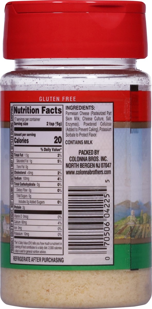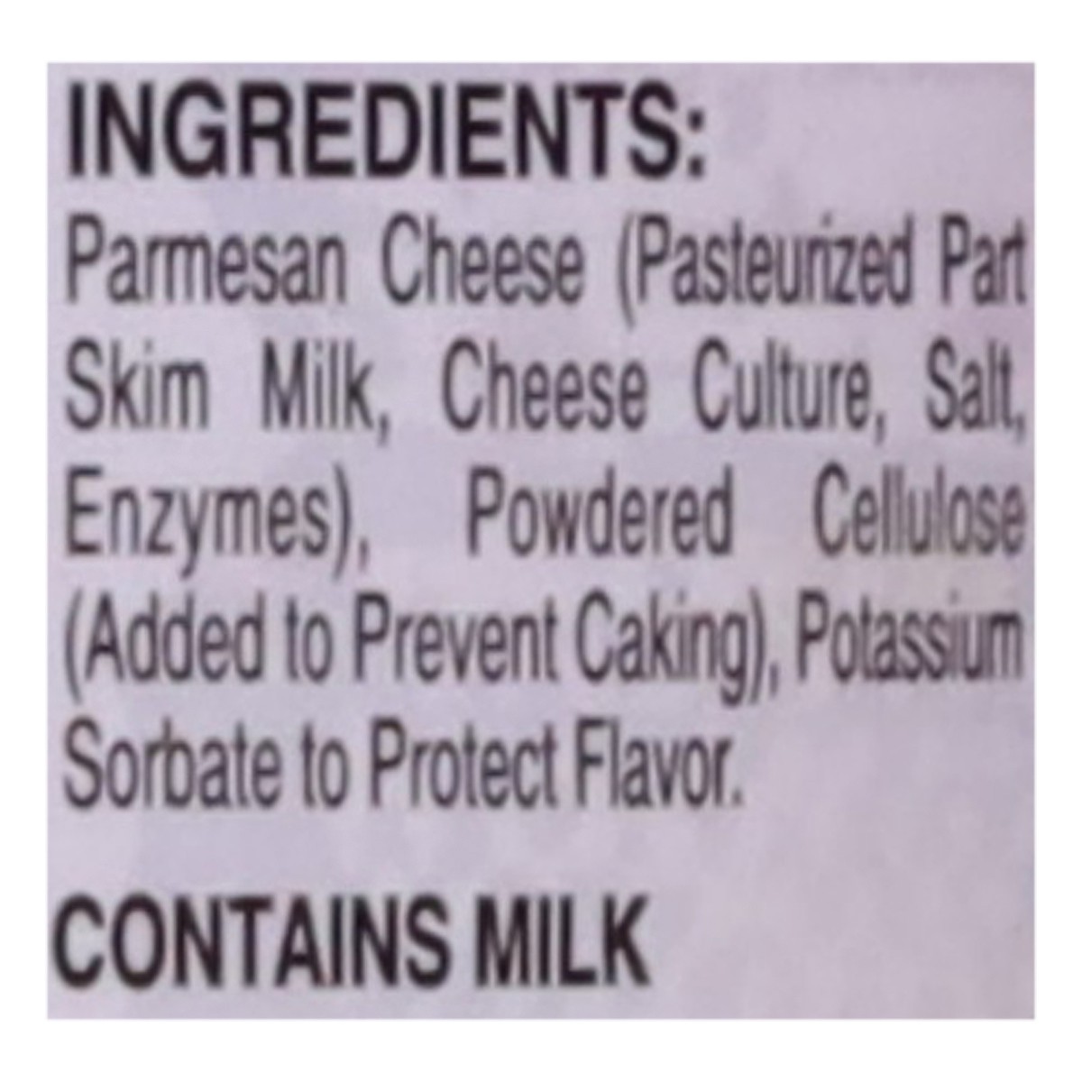 Parmesan Cheese (Pasteurized Part Skim Milk, Cheese Culture, Salt, Enzymes), Powdered Cellulose (Added to Prevent Caking), Potassium Sorbate to Protect Flavor.