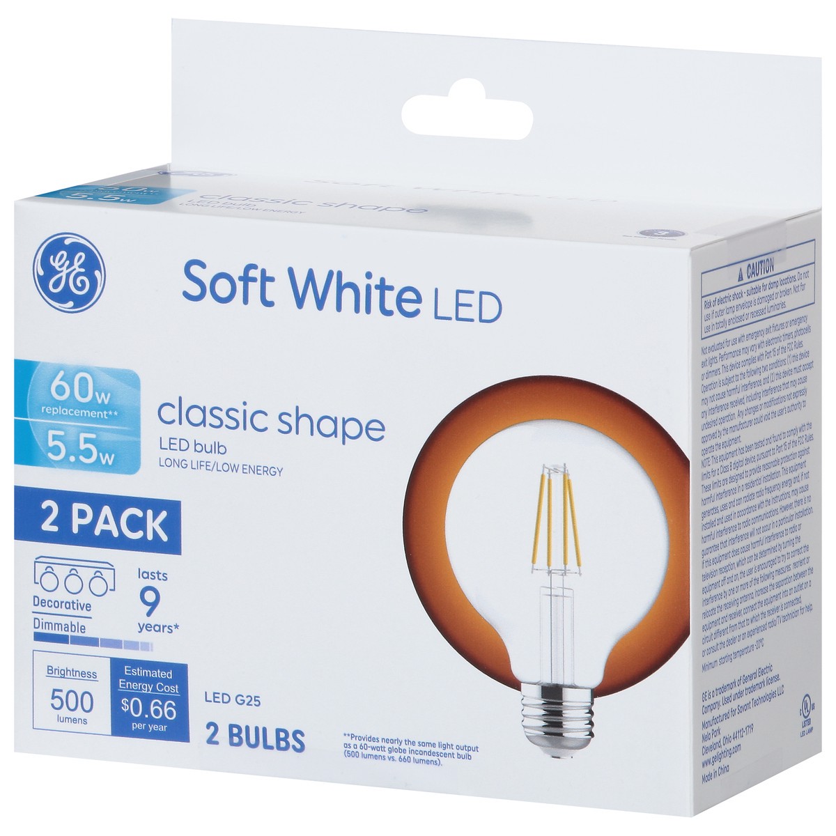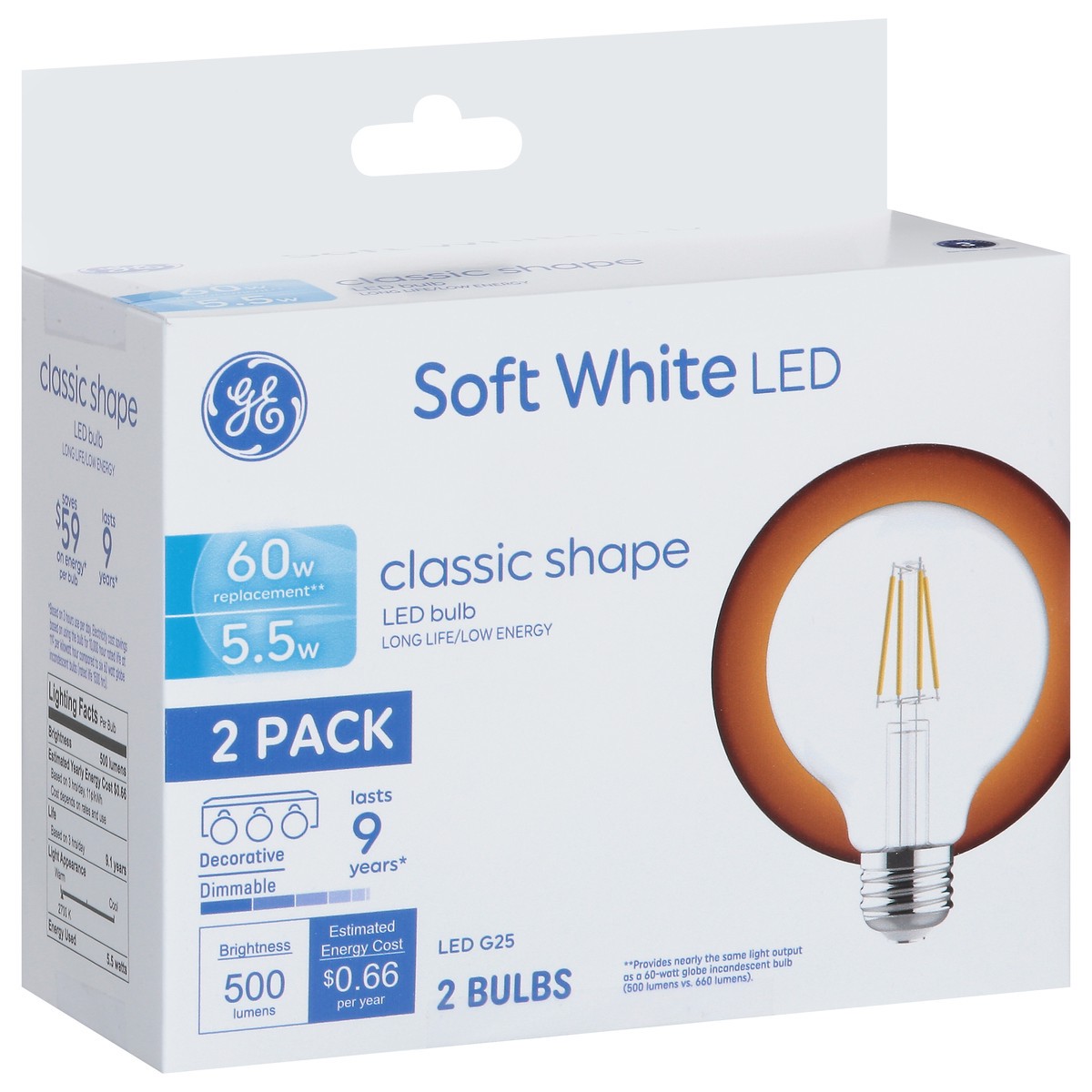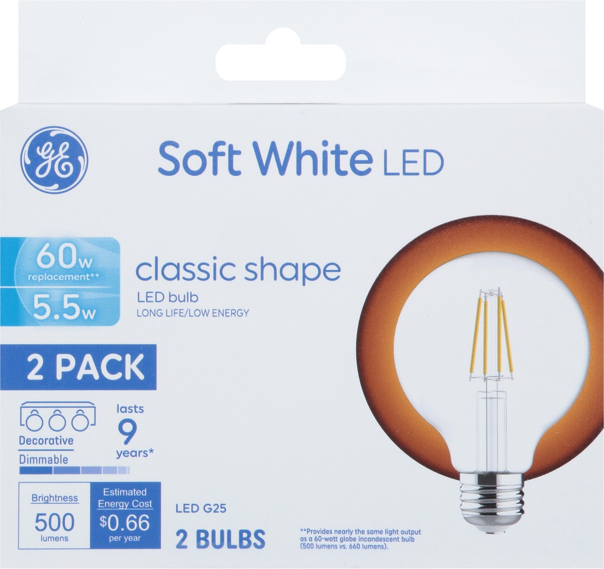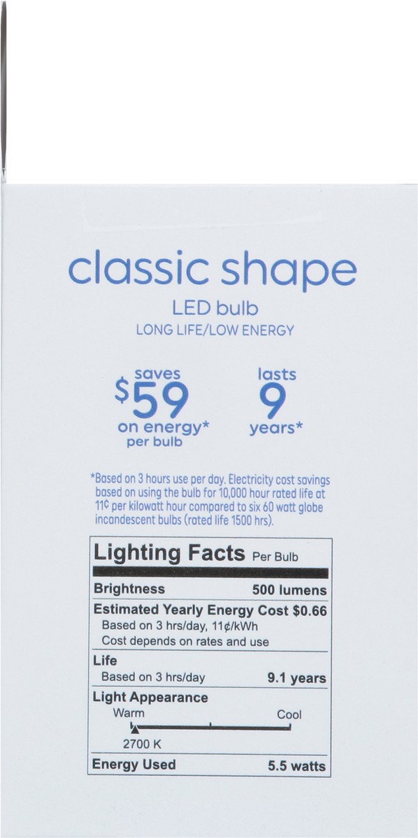 Brightness Quantity: 500 lumens. Energy Info: $0.66 based 3 3 hrs/day, 11 cents/kWh. Cost depends on rates and use. 5.5 watts. Package Info: 2-Pack. Bulb Info: LED. Is Dimmable. Screw. Bulb Life: 9.1 …