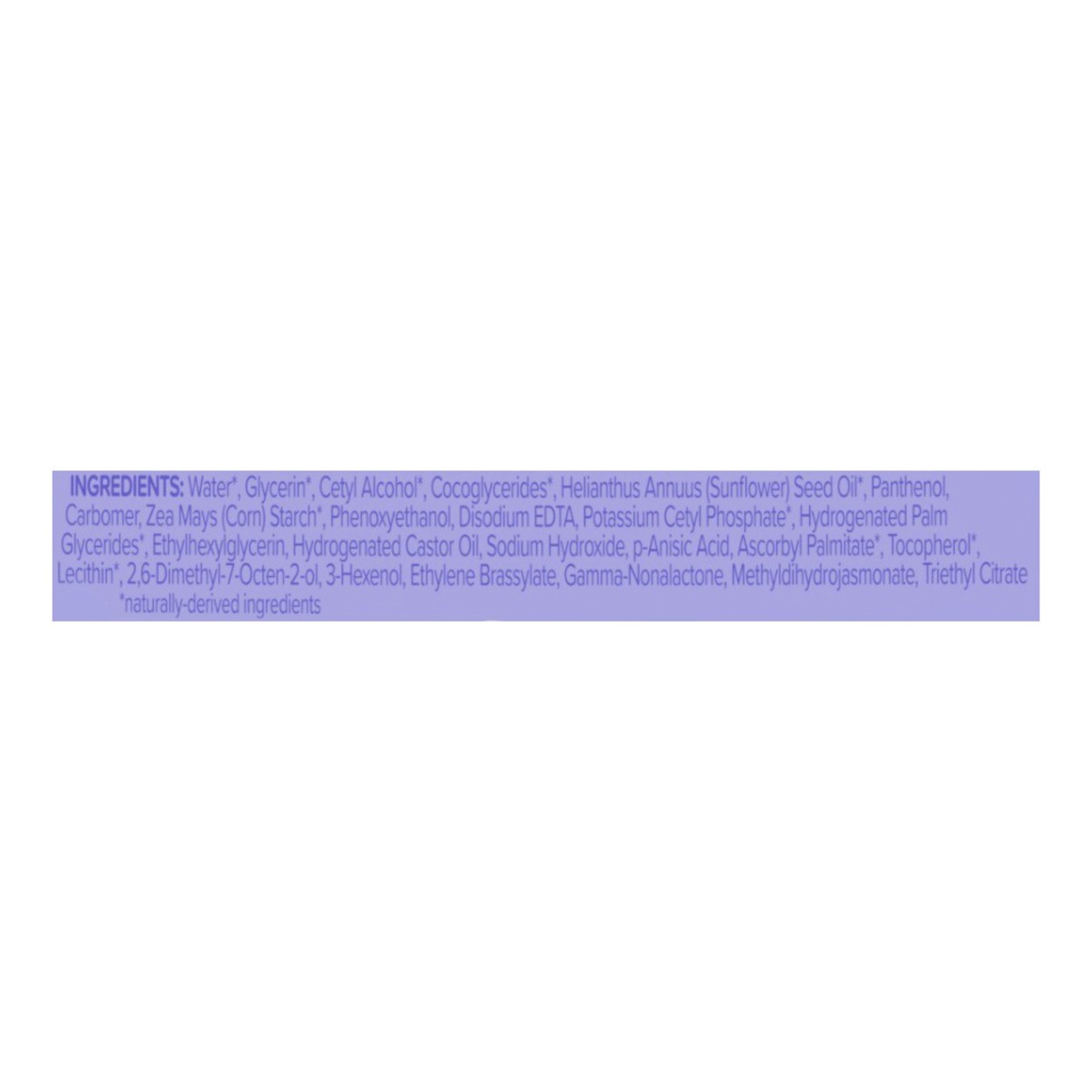Water, Glycerin, Cetyl Alcohol, Cocoglycerides, Helianthus Annuus (Sunflower) Seed Oil, Panthenol, Zea Mays (Corn) Starch, Hydrogenated Castor Oil, Carbomer, Phenoxyethanol, Disodium EDTA, Potassium C…