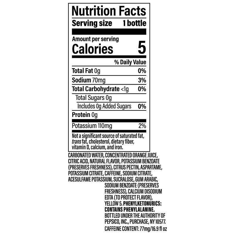 Carbonated Water, Concentrated Orange Juice, Citric Acid, Natural Flavor, Potassium Benzoate (Preserves Freshness), Citrus Pectin, Aspartame, Potassium Citrate, Caffeine, Sodium Citrate, Acesulfame Po…