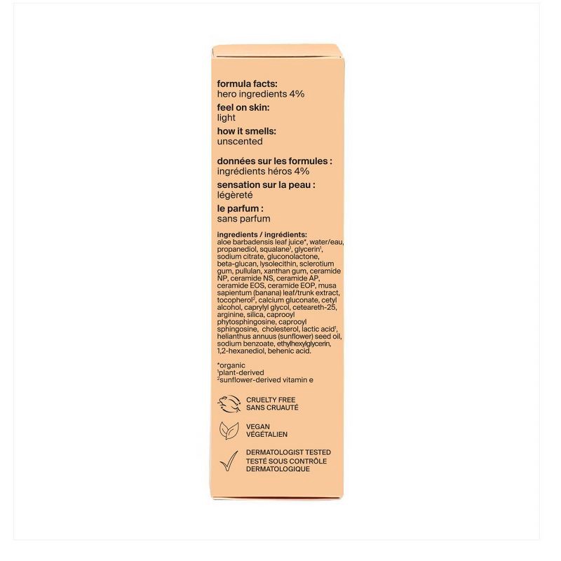 aloe barbadensis leaf juice*, water/eau, propanediol, squalane¹, glycerin¹, sodium citrate, gluconolactone, beta-glucan, lysolecithin, sclerotium gum, pullulan, xanthan gum, ceramide NP, ceramide NS, …