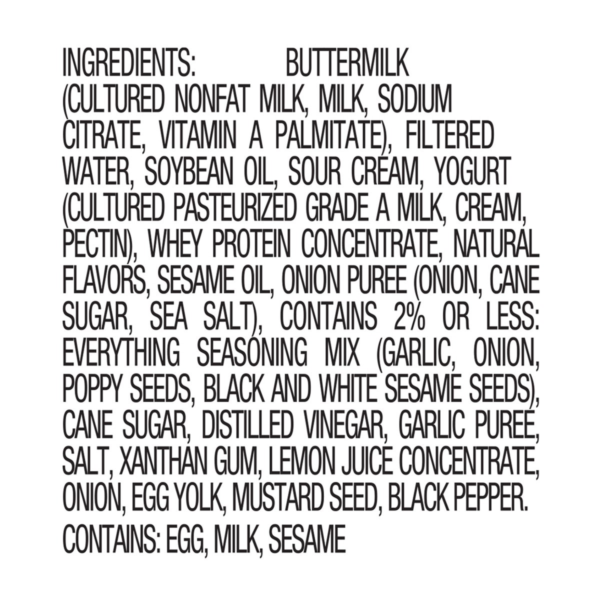 Buttermilk (Cultured Nonfat Milk, Milk, Sodium Citrate, Vitamin A Palmitate), Filtered Water, Soybean Oil, Sour Cream, Yogurt (Cultured Pasteurized Grade A Milk, Cream, Pectin), Whey Protein Concentra…