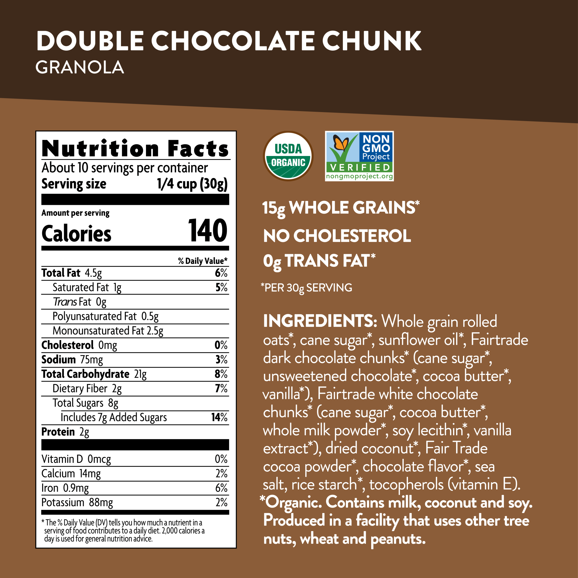 Whole Grain Rolled Oats (Organic), Cane Sugar (Organic), Sunflower (Organic) and/or Soy (Organic) Oil, Fair Trade Dark Chocolate Chunks (Organic) (Cane Sugar (Organic), Unsweetened Chocolate (Organic)…