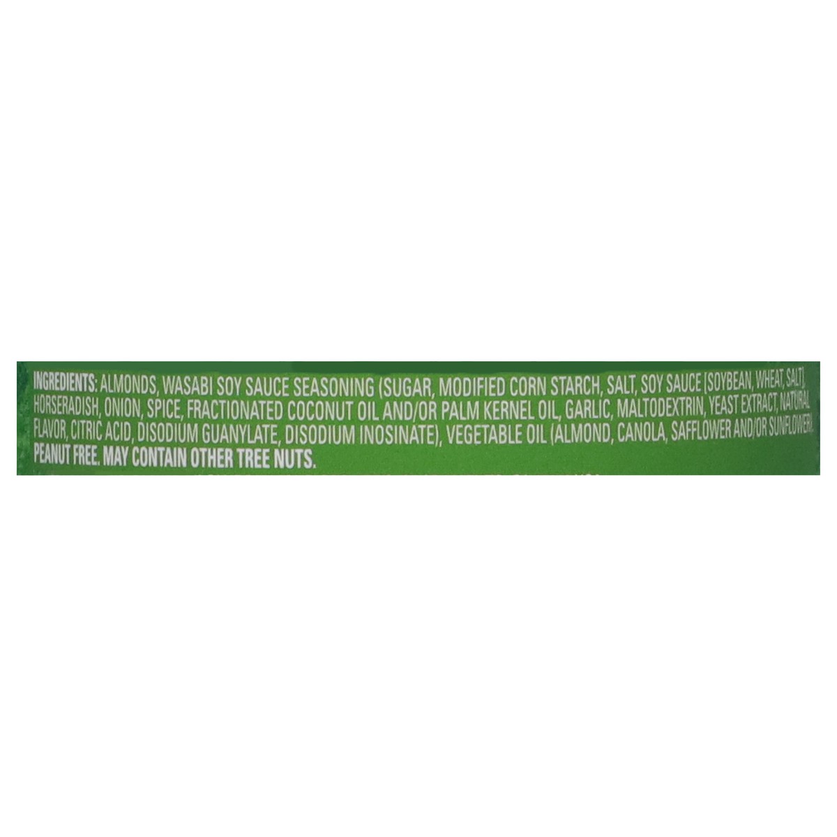 ALMONDS, WASABI SOY SAUCE SEASONING (SUGAR, MODIFIED CORN STARCH, SALT, SOY SAUCE [SOYBEAN, WHEAT, SALT], HORSERADISH, ONION, SPICE FRACTIONATED COCONUT OIL AND/OR PALM KERNEL OIL, GARLIC, MALTODEXTRI…