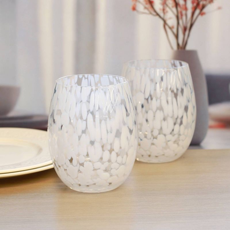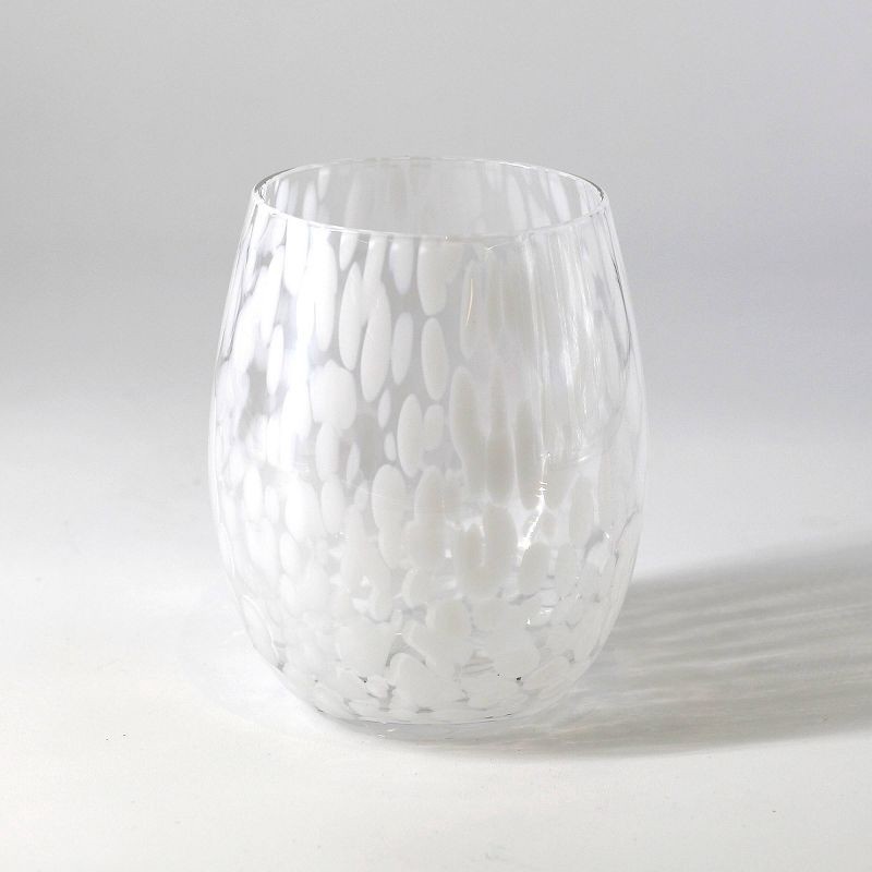 This stemless drinking glass decorated with white speckles. Its rounded shape gives it a contemporary, elegant feel, making it suitable for both casual and decorative use. The scattered color pattern …