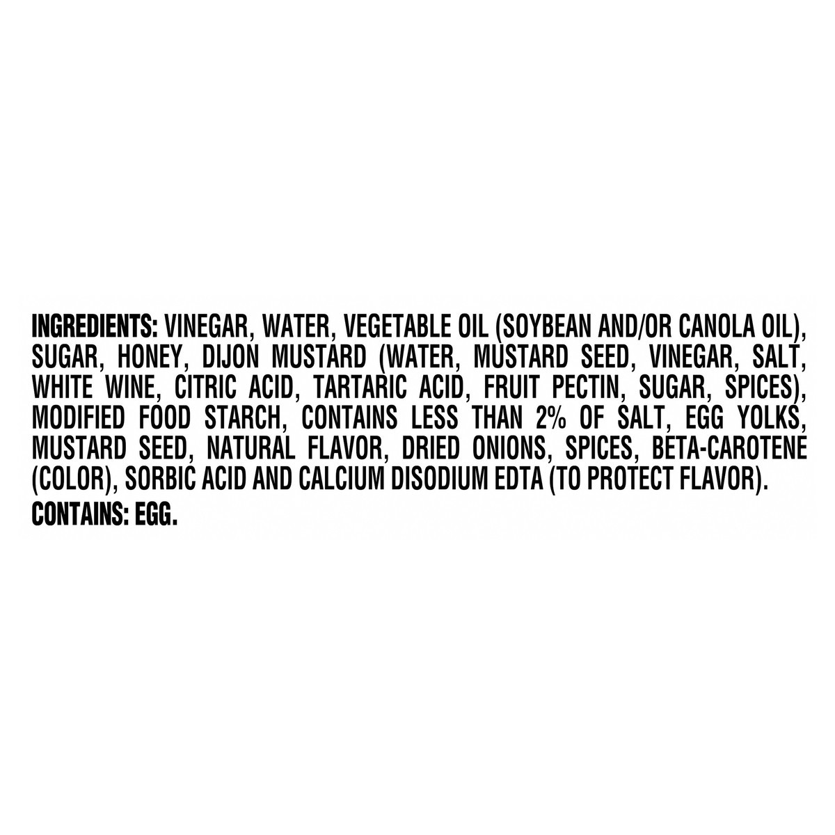 VINEGAR, WATER, SOYBEAN OIL, SUGAR, HONEY, DIJON MUSTARD (WATER, MUSTARD SEED, VINEGAR, SALT, WHITE WINE, CITRIC ACID, TARTARIC ACID, FRUIT PECTIN, SUGAR, SPICES), MODIFIED FOOD STARCH, CONTAINS LESS …