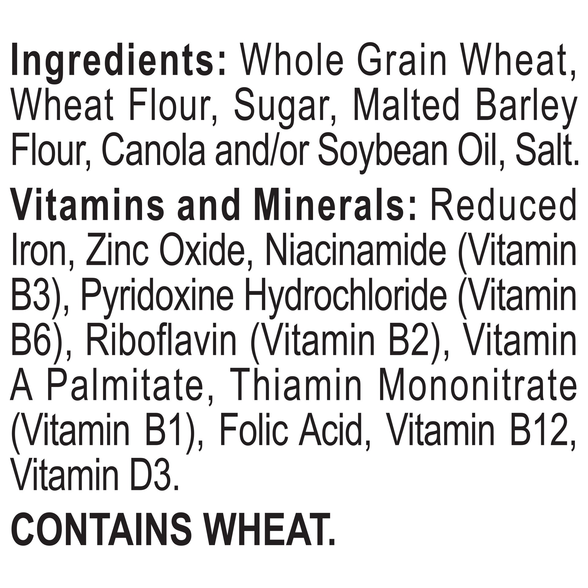 Whole Grain Wheat, Wheat Flour, Sugar, Malted Barley Flour, Canola and/or Soybean Oil, Salt. Vitamins and Minerals: Reduced Iron, Zinc Oxide, Niacinamide (Vitamin B3), Pyridoxine Hydrochloride (Vitami…