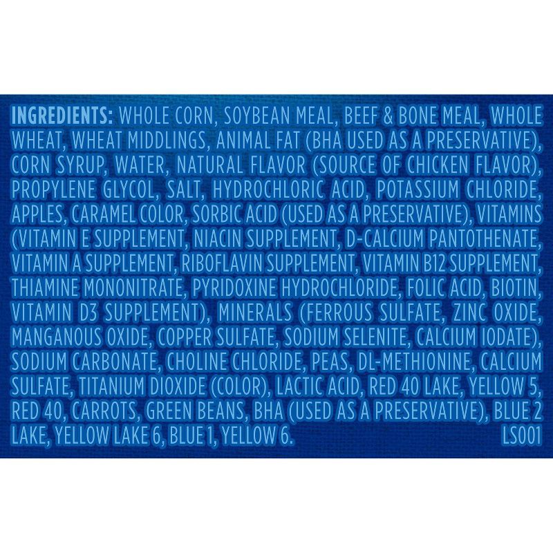 Whole Corn, Soybean Meal Beef & Bone Meal, Whole Wheat, Animal Fat (BHA Used as a Preservative Corn Syrup, Water, Wheat Middlings, Natural Flavor (Source of Bacon Flavor), Propylene Glycol, Salt, Hydr…