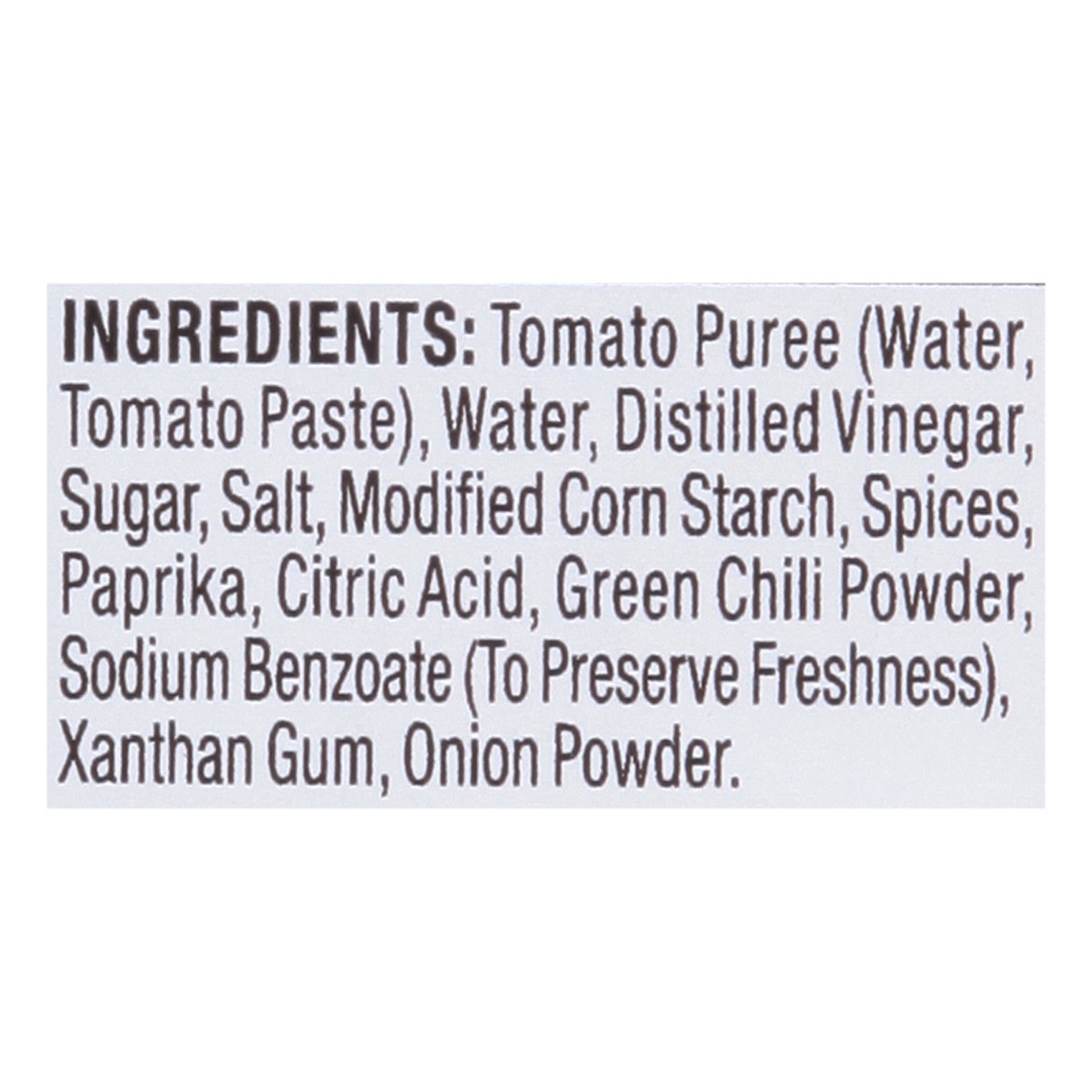 Tomato Puree (Water, Tomato Paste), Water, Distilled Vinegar, Sugar, Salt, Modified Corn Starch, Spices, Paprika, Citric Acid, Green Chili Powder, Sodium Benzoate (to Preserve Freshness), Xanthan Gum,…