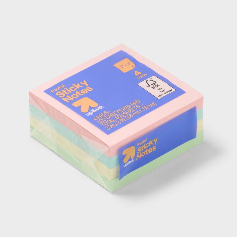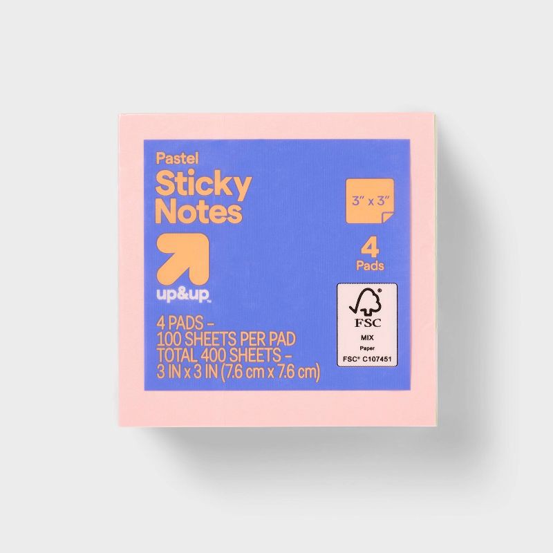 Complete your everyday tasks with the 4pk 3"x3" Sticky Notes from up&up. These sticky notes feature 400 sheets which will keep you stocked up for a long time. They come in four pretty colors so you ca…